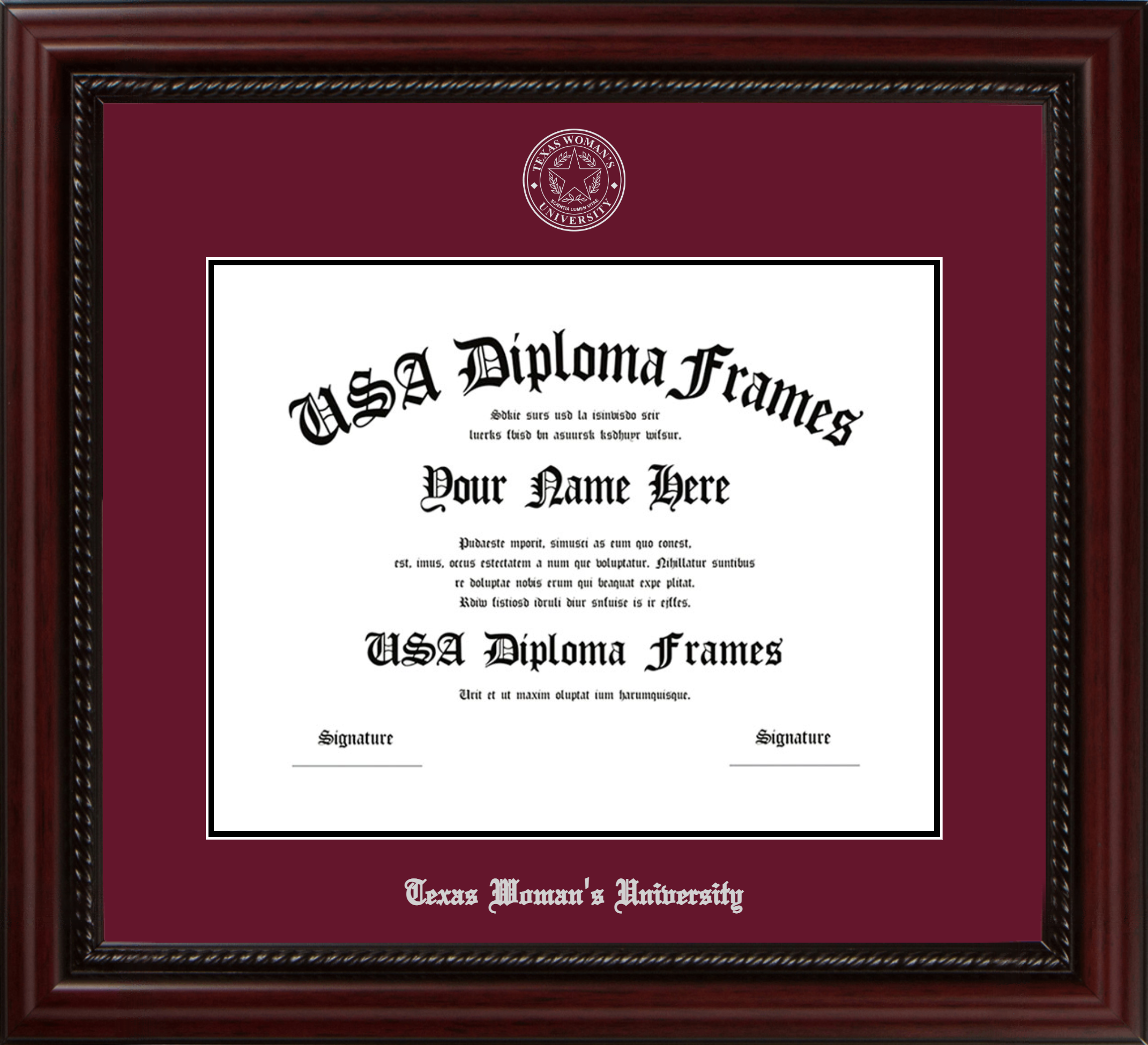 Want to explore more styles? Browse our full range of diploma frame layouts, or visit the Texas Woman's University to view options available for your school. Looking for a fully personalized design? Try our custom Frame Builder and create a frame that’s uniquely yours.