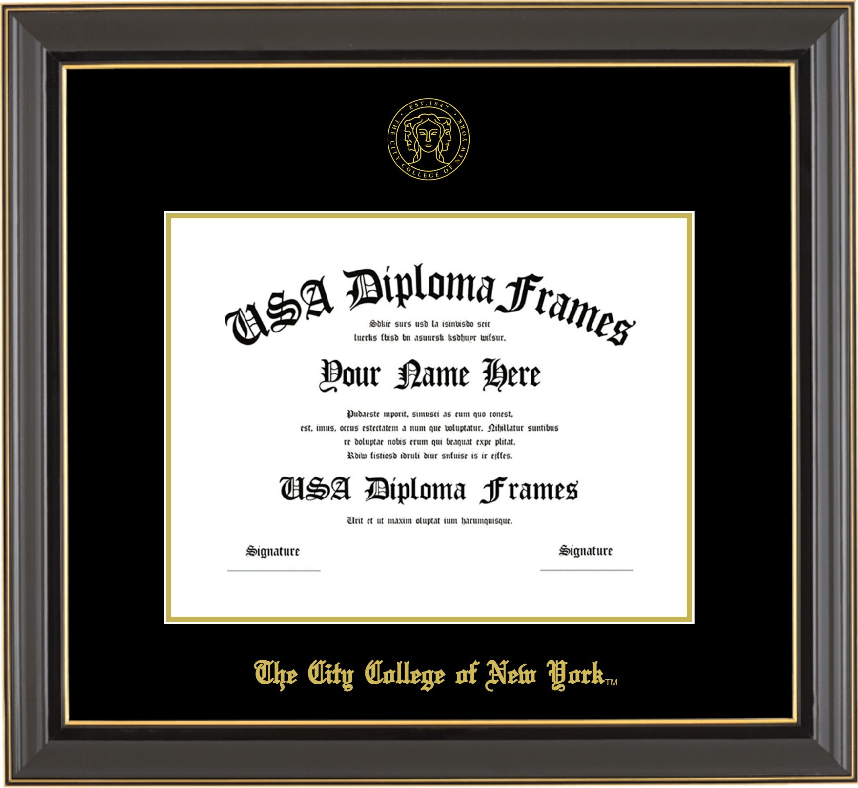 The City College of New York Diploma Frame – Black Gold Trim Glossy – Black and Gold Mat