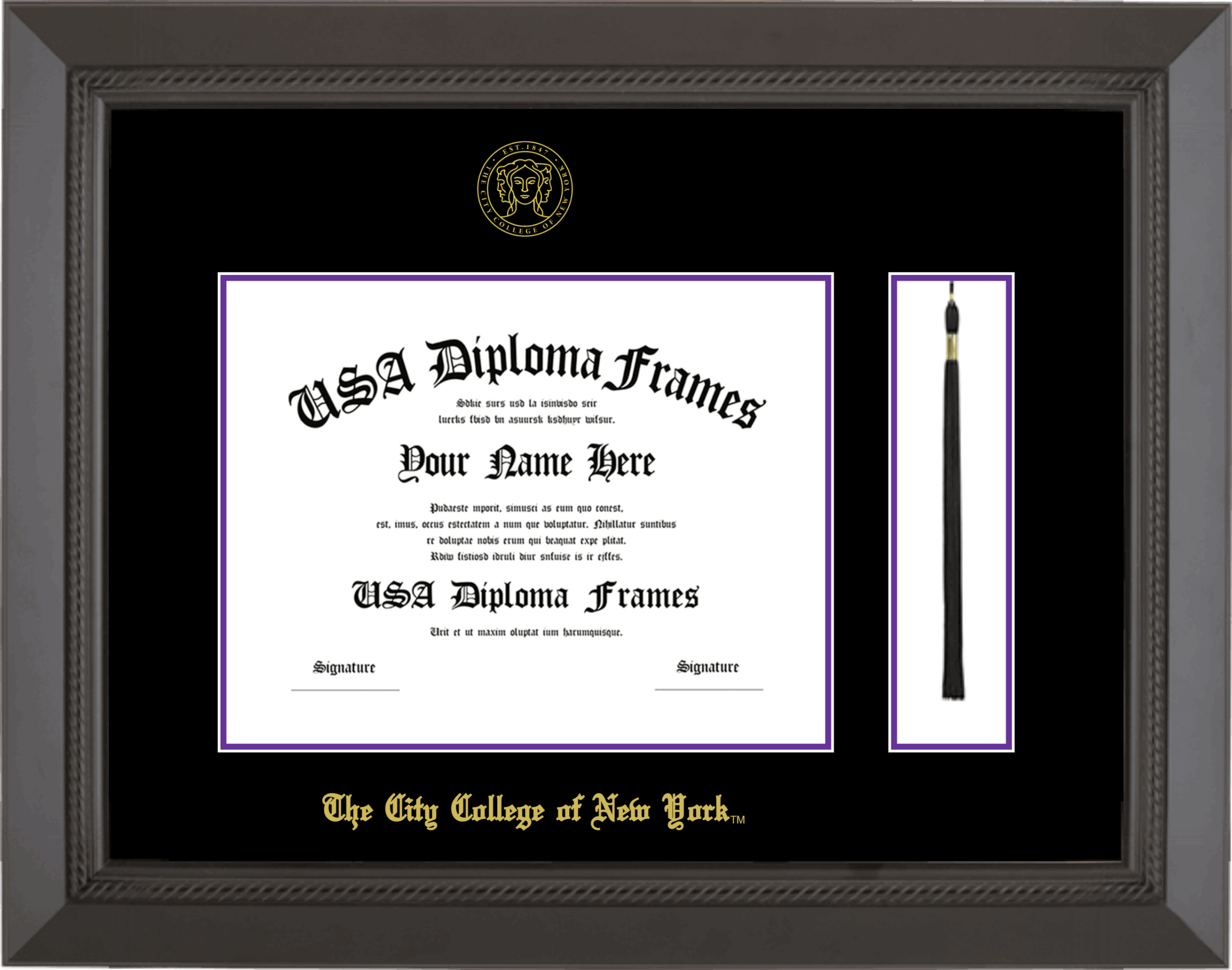 The City College of New York Diploma Frame with Tassel – Black Rope – Black and Purple Mat