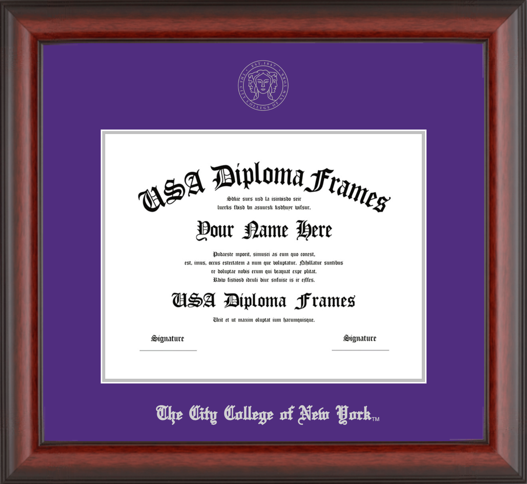 The City College of New York Diploma Frame – Cherry Mahogany Matte – Purple and Silver Mat