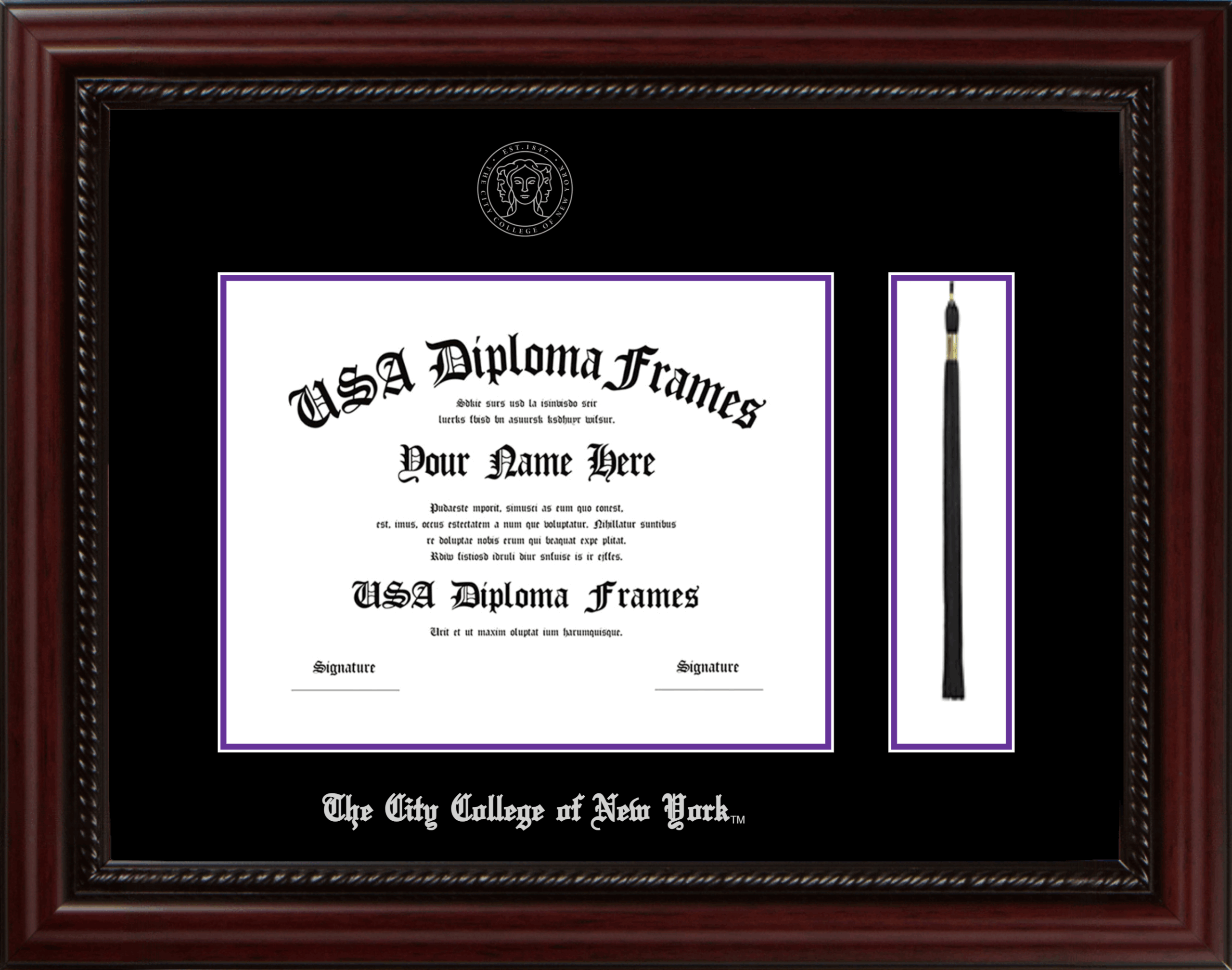 The City College of New York Diploma Frame with Tassel – Executive Cherry Rope – Black and Purple Mat