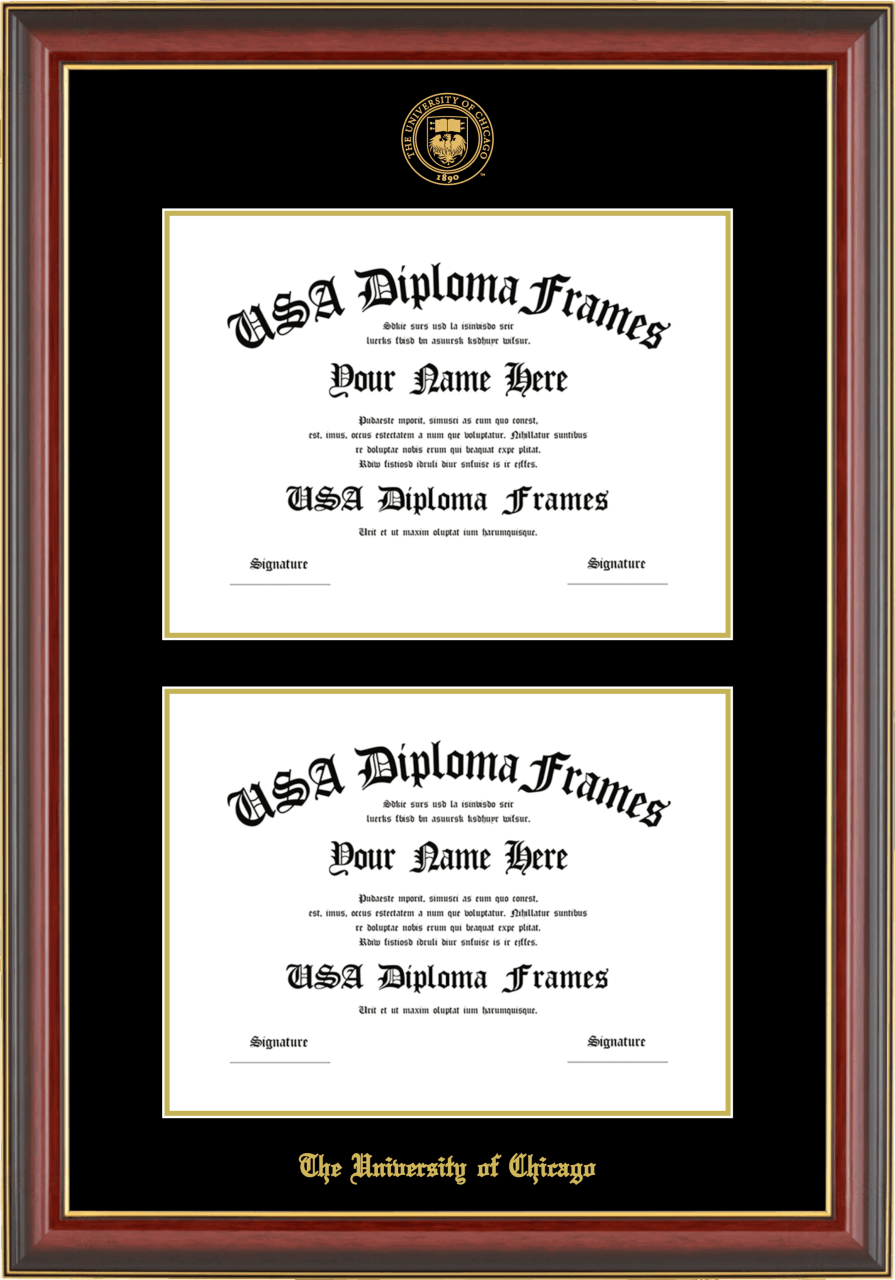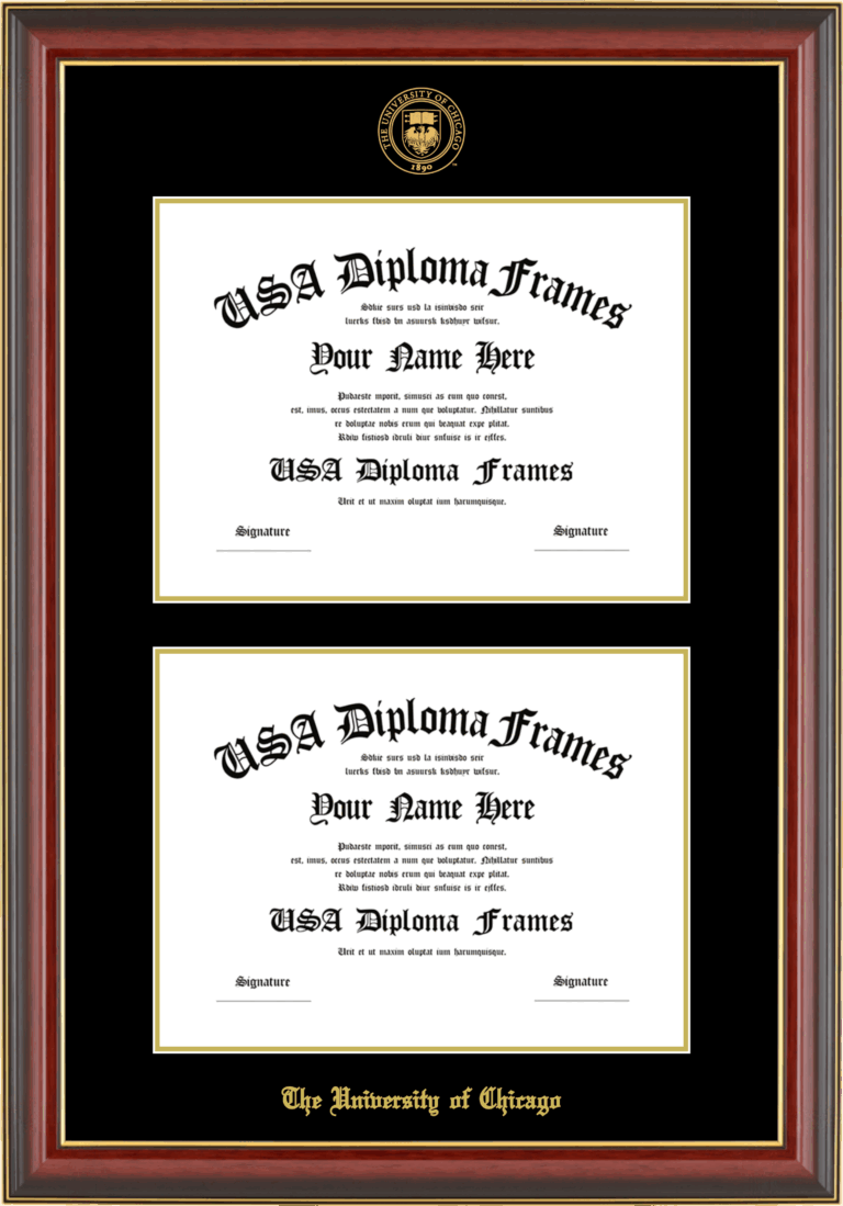 The University of Chicago Double Diploma Frame – Double Document – Cherry Mahogany Gold Trim Glossy – Black and Gold Mat
