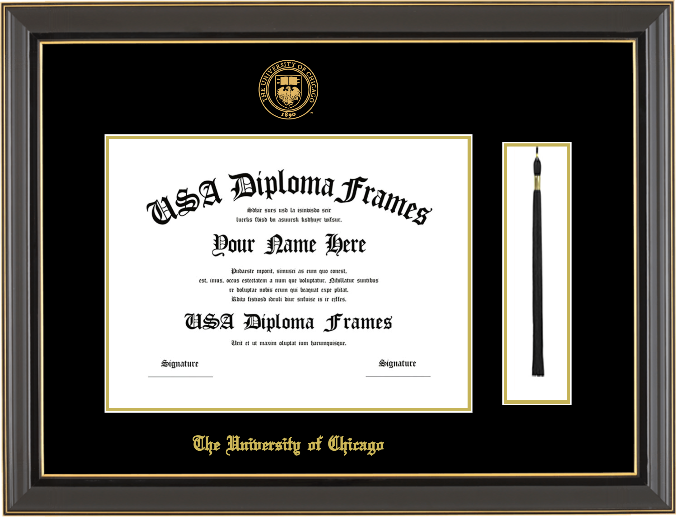 The University of Chicago – Single Horizontal Document ( Diploma ) – Black Gold Trim Glossy – Black Mat – Gold Accent Mat – With Tassel(Default) – With Seal(University Seal Gold) – With Gold Embossing (The University of Chicago)