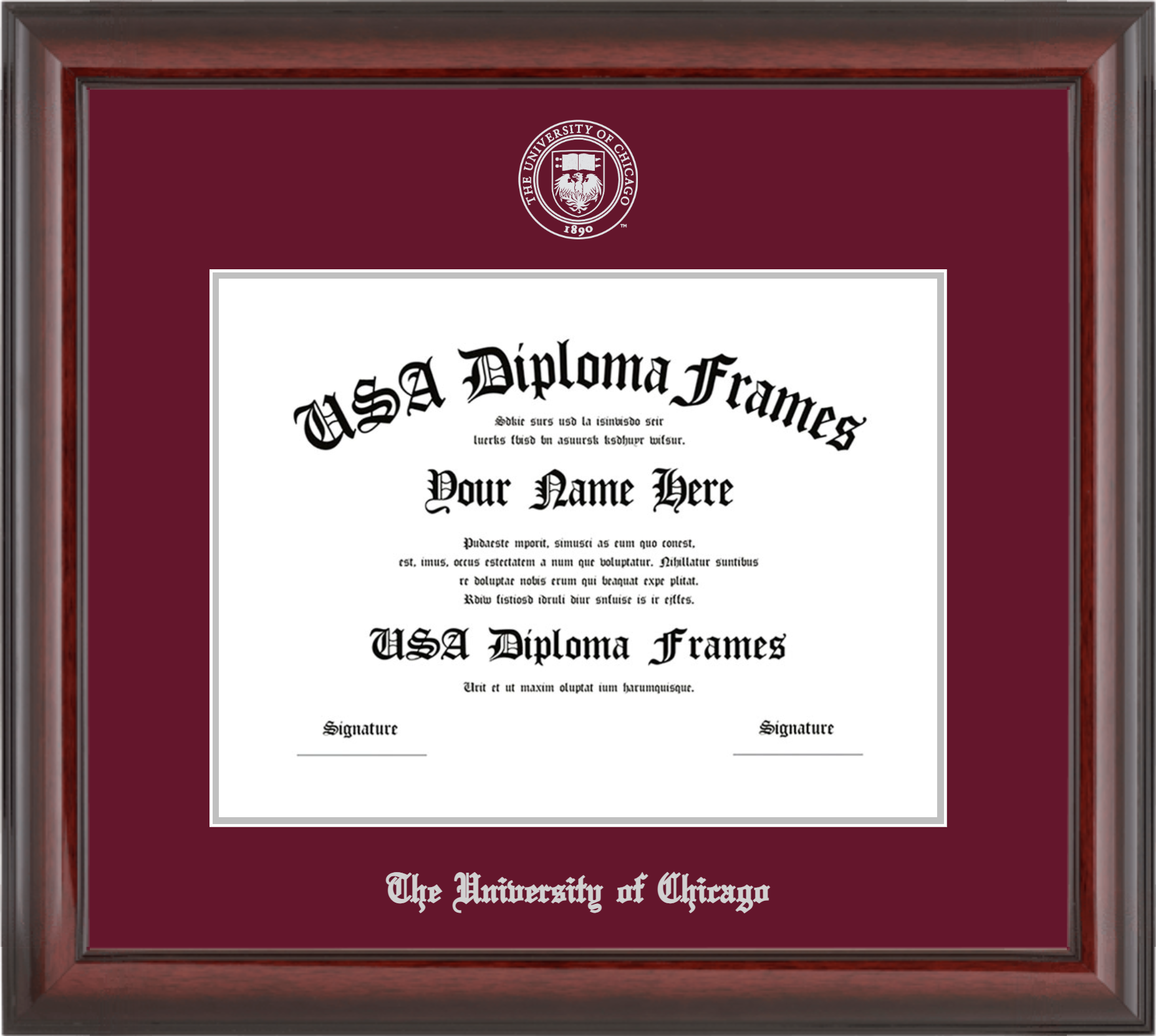 The University of Chicago – Single Horizontal Document ( Diploma ) – Cherry Mahogany Glossy – Maroon Mat – Silver Accent Mat – With Seal(University Seal Silver) – With Silver Embossing (The University of Chicago)