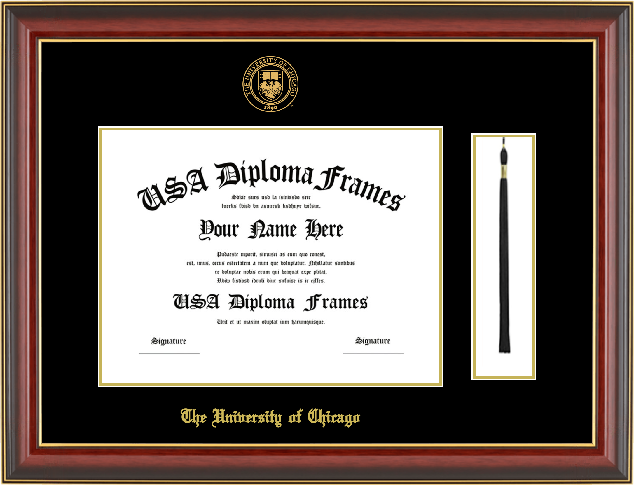 The University of Chicago – Single Horizontal Document ( Diploma ) – Cherry Mahogany Gold Trim Glossy – Black Mat – Gold Accent Mat – With Tassel(Default) – With Seal(University Seal Gold) – With Gold Embossing (The University of Chicago)