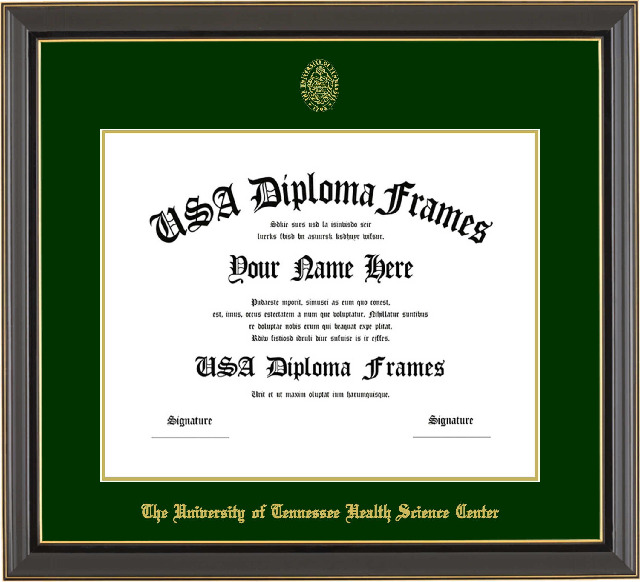The University of Tennessee Health Science Center – Single Horizontal Document ( Diploma ) – Black Gold Trim Glossy – Winter Green Mat – Gold Accent Mat – With Seal(University Seal Gold) – With Gold Embossing (The University of Tennessee Health Science Center)