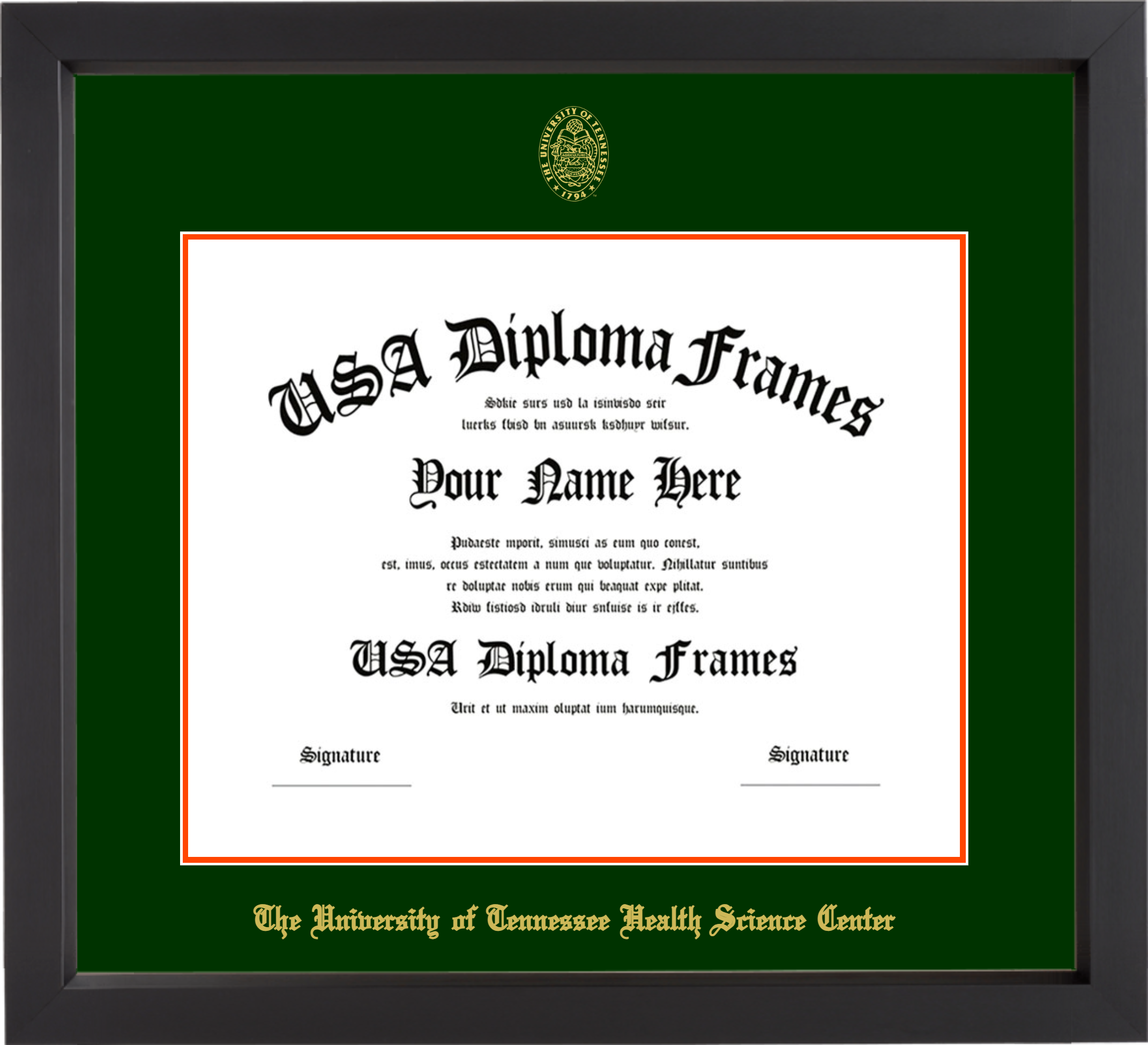 The University of Tennessee Health Science Center – Single Horizontal Document ( Diploma ) – Black Matte – Winter Green Mat – Orange Accent Mat – With Seal(University Seal Gold) – With Gold Embossing (The University of Tennessee Health Science Center)