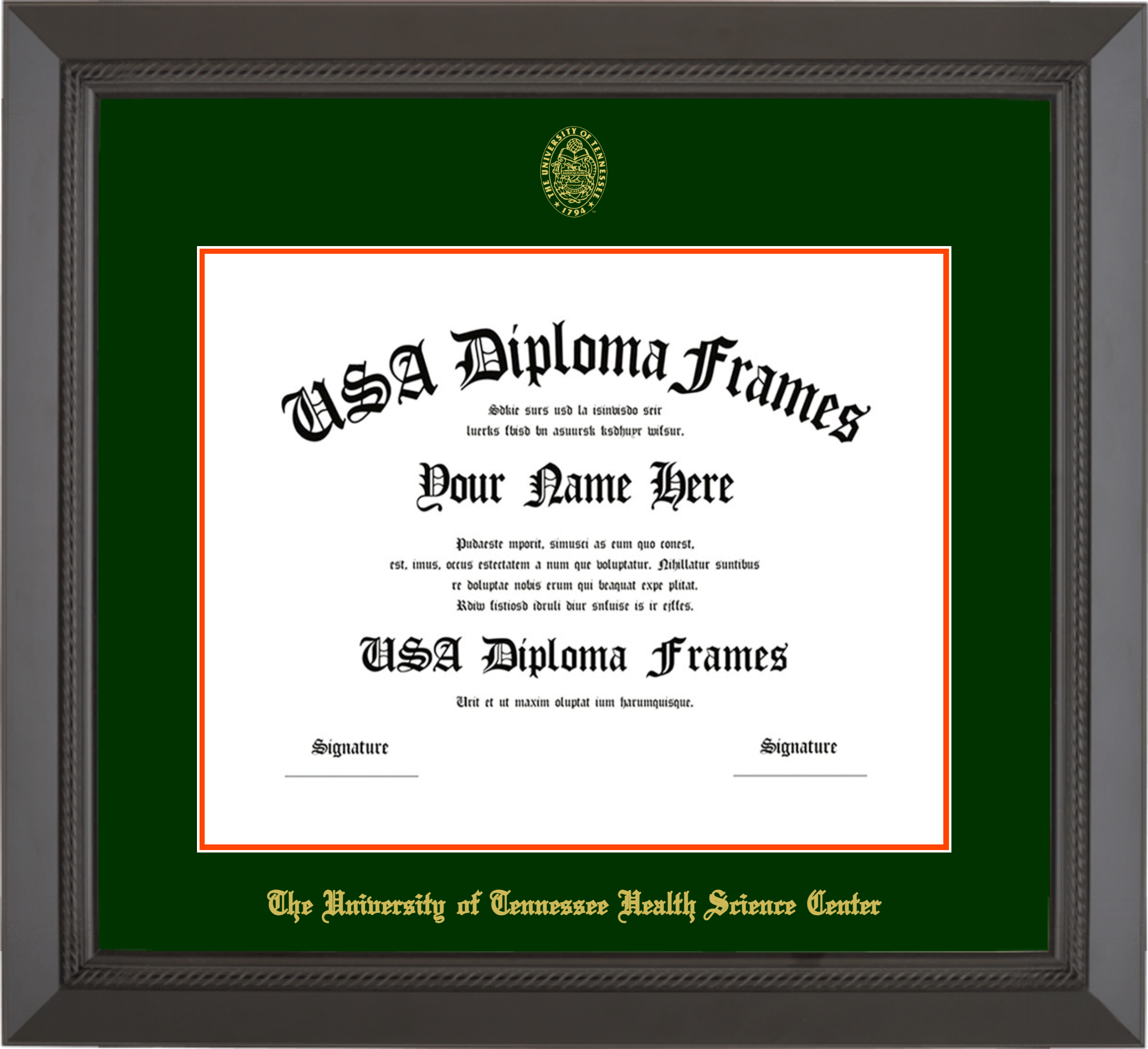 The University of Tennessee Health Science Center Diploma Frame – Black Rope – Winter Green and Orange Mat – 12×15