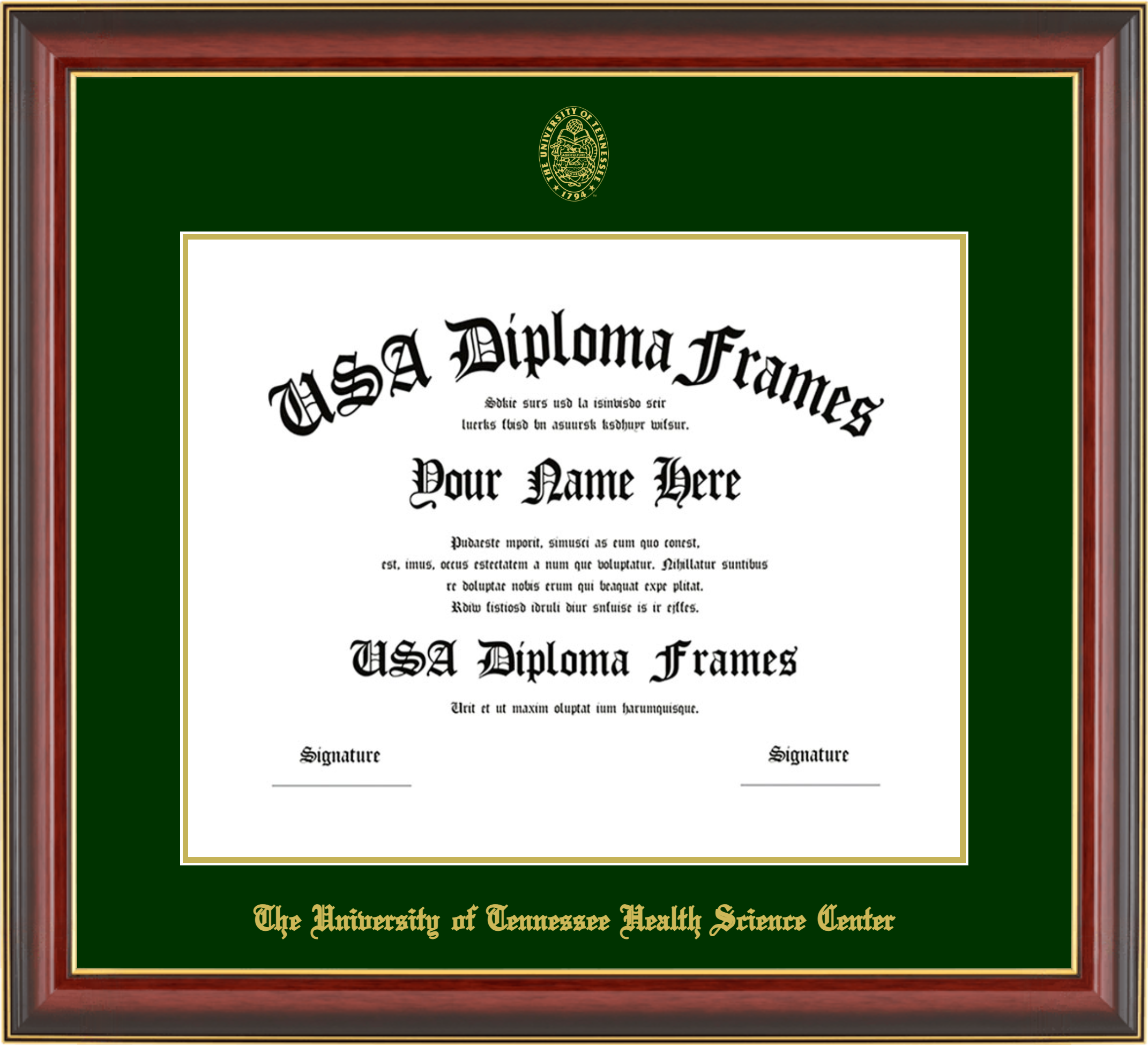 The University of Tennessee Health Science Center – Single Horizontal Document ( Diploma ) – Cherry Mahogany Gold Trim Glossy – Winter Green Mat – Gold Accent Mat – With Seal(University Seal Gold) – With Gold Embossing (The University of Tennessee Health Science Center)