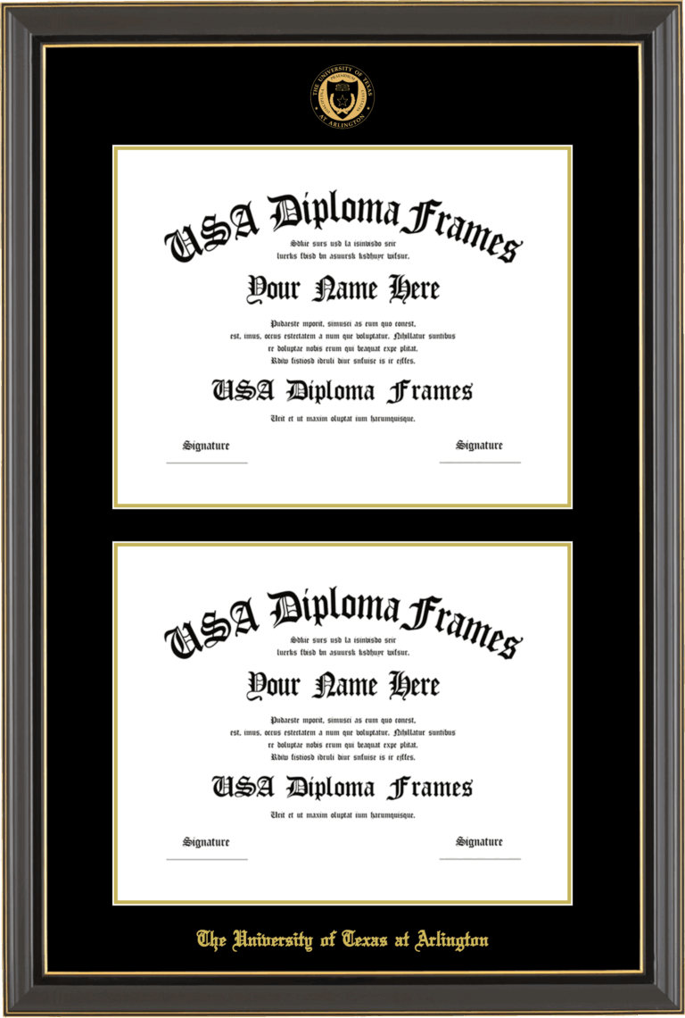 The University of Texas at Arlington Double Diploma Frame – Double Document – Black Gold Trim Glossy – Black and Gold Mat