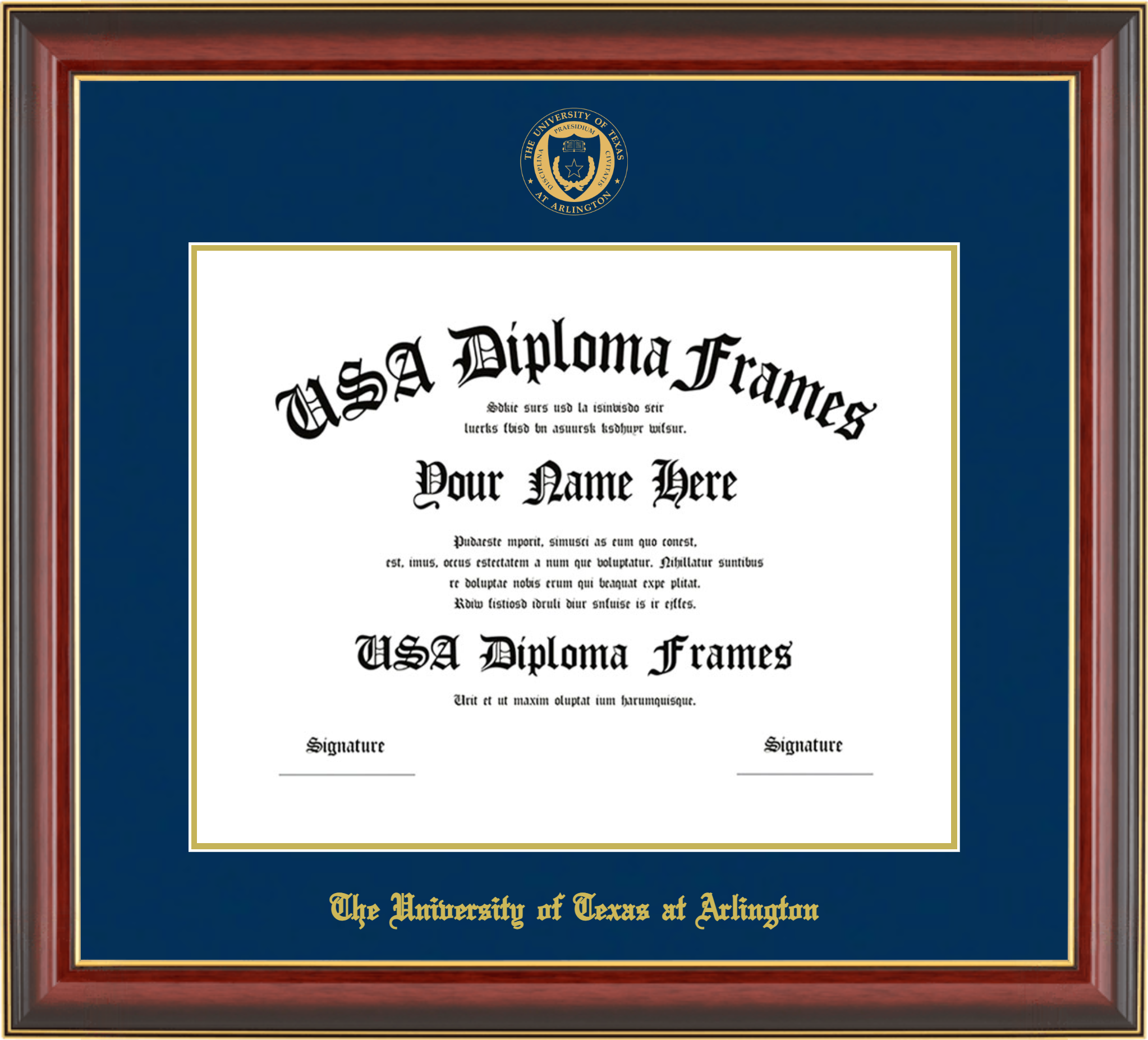 The University of Texas at Arlington Diploma Frame – Cherry Mahogany Gold Trim Glossy – Navy and Gold Mat