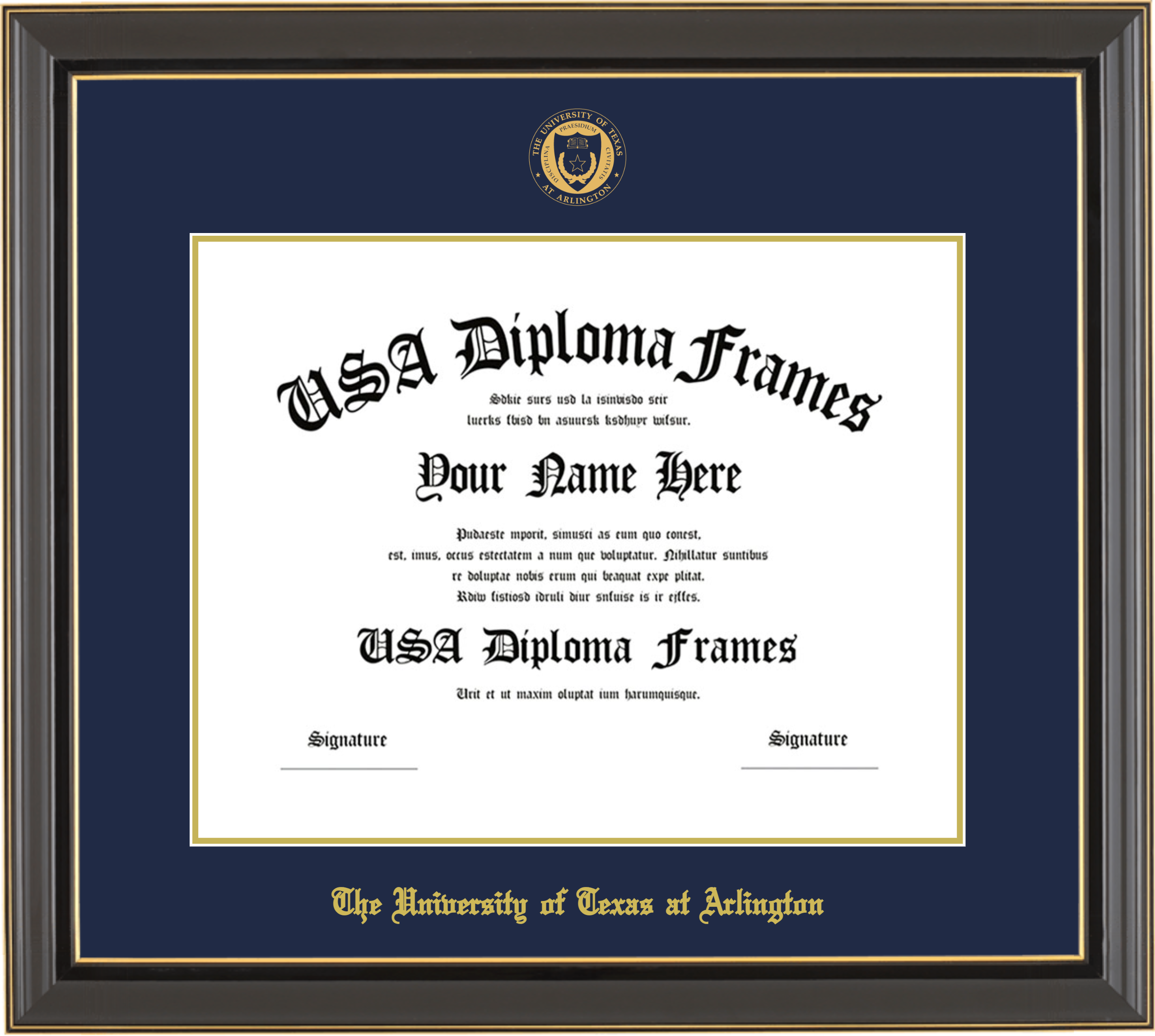 The University of Texas at Arlington – Single Horizontal Document ( Diploma ) – Black Gold Trim Glossy – Navy Mat – Gold Accent Mat – With Seal(University Seal Gold) – With Gold Embossing (The University of Texas at Arlington)