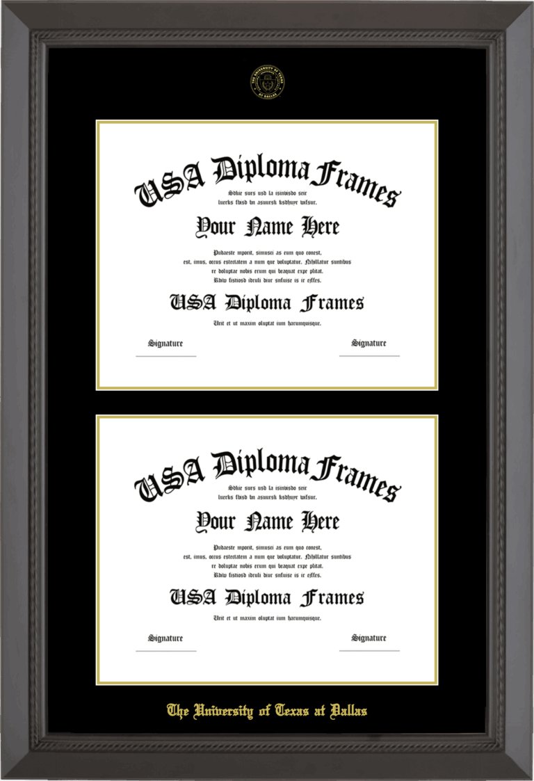 The University of Texas at Dallas Double Diploma Frame – Double Document – Black Rope – Black and Gold Mat