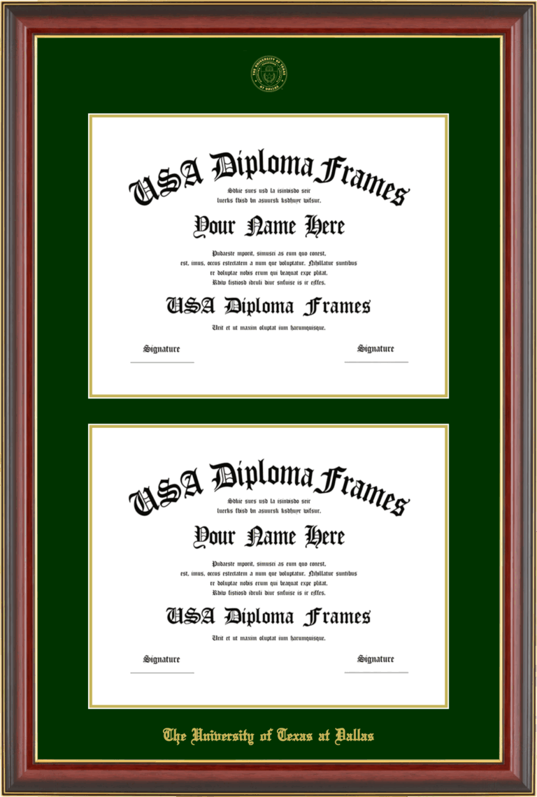 The University of Texas at Dallas Double Diploma Frame – Double Document – Cherry Mahogany Gold Trim Glossy – Winter Green and Gold Mat
