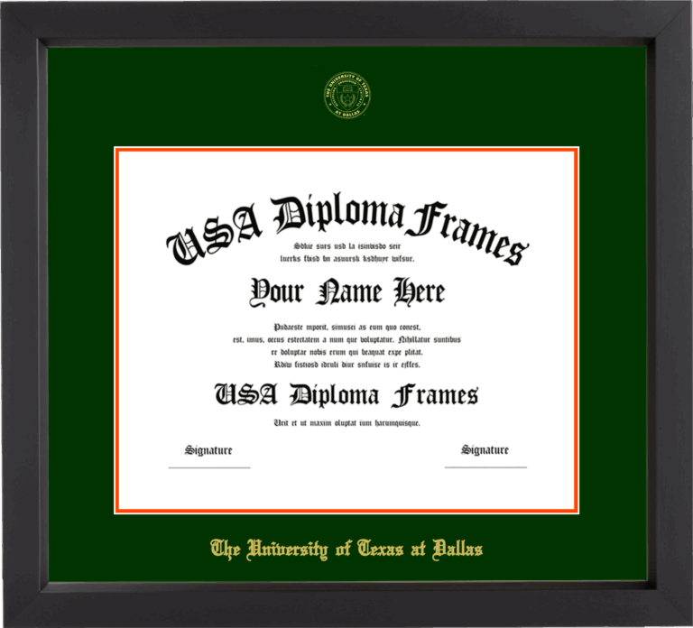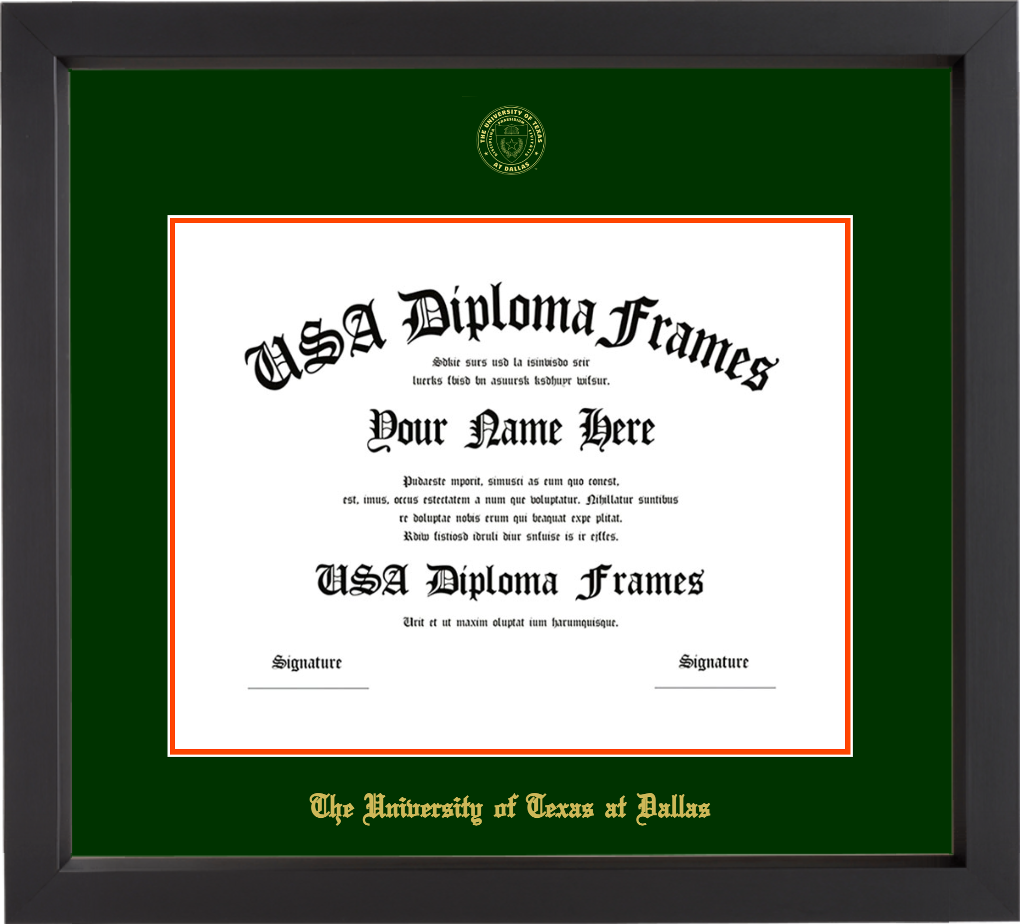 The University of Texas at Dallas Diploma Frame – Black Matte – Winter Green and Orange Mat