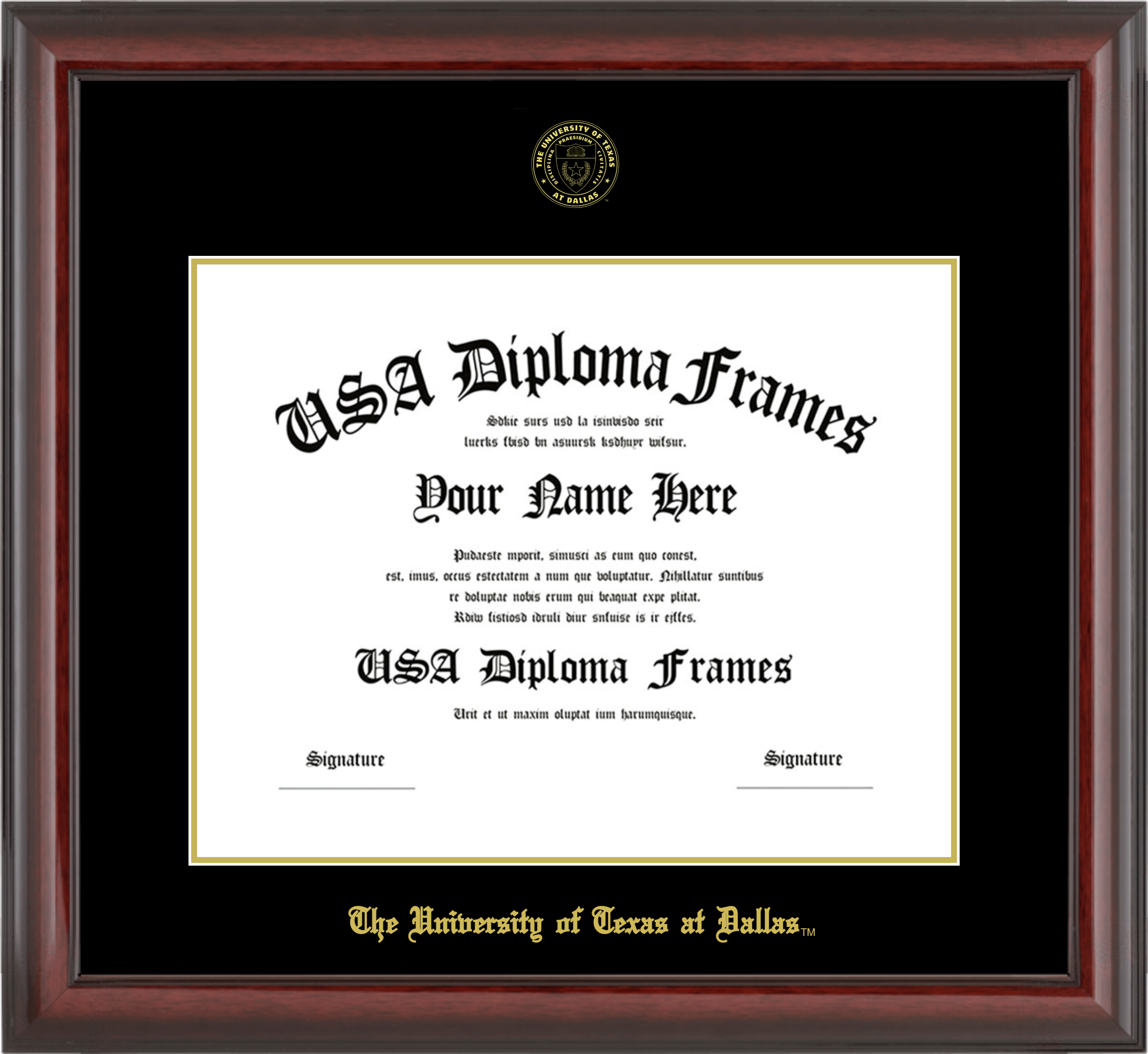The University of Texas at Dallas Diploma Frame – Cherry Mahogany Glossy – Black and Gold Mat