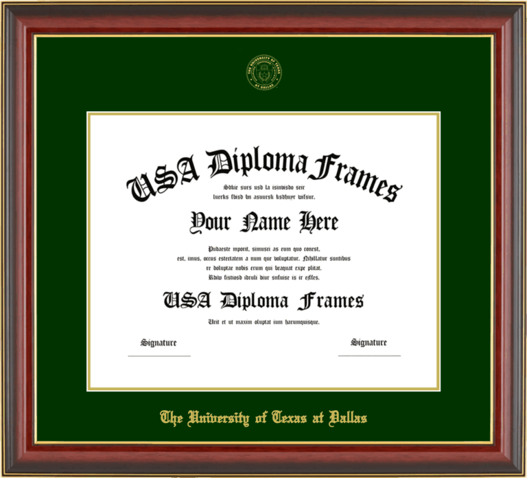 Want to explore more styles? Browse our full range of diploma frame layouts, or visit the The University of Texas at Dallas to view options available for your school. Looking for a fully personalized design? Try our custom Frame Builder and create a frame that’s uniquely yours.