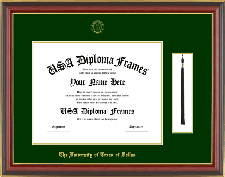 The University of Texas at Dallas Diploma Frame with Tassel – Cherry Mahogany Gold Trim Glossy – Winter Green and Gold Mat