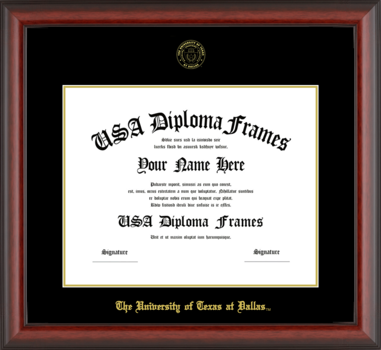 Want to explore more styles? Browse our full range of diploma frame layouts, or visit the The University of Texas at Dallas to view options available for your school. Looking for a fully personalized design? Try our custom Frame Builder and create a frame that’s uniquely yours.