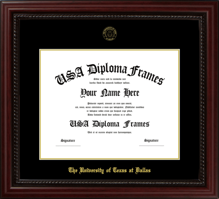 Want to explore more styles? Browse our full range of diploma frame layouts, or visit the The University of Texas at Dallas to view options available for your school. Looking for a fully personalized design? Try our custom Frame Builder and create a frame that’s uniquely yours.