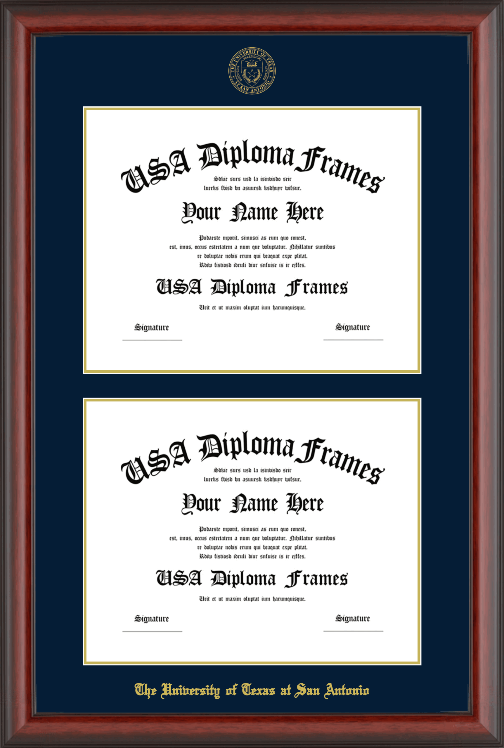 The University of Texas at San Antonio Double Diploma Frame – UTSA Double Document – Cherry Mahogany Matte – Navy and Gold Mat