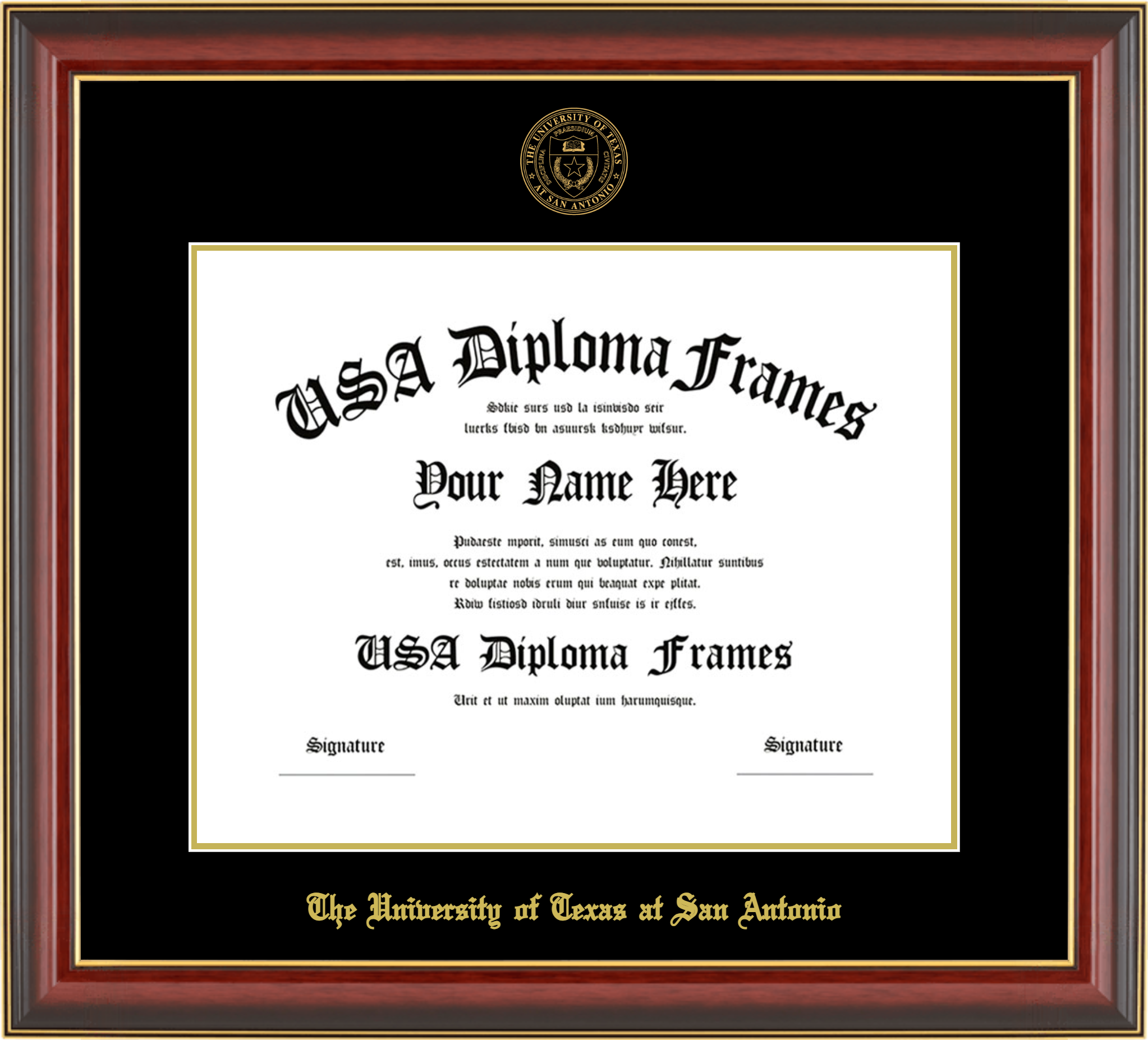The University of Texas at San Antonio Diploma Frame – UTSA – Cherry Mahogany Gold Trim Glossy – Black and Gold Mat
