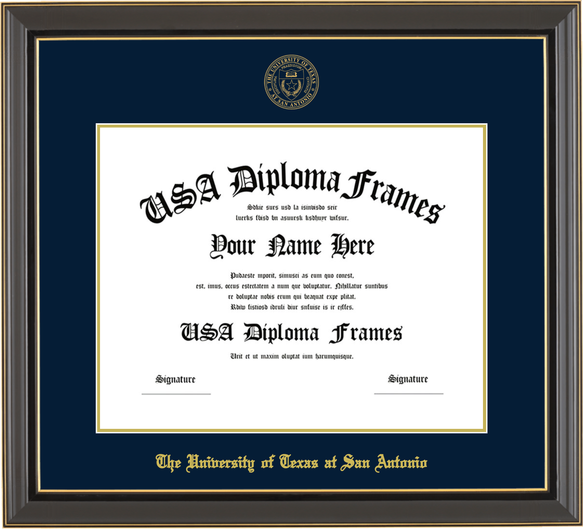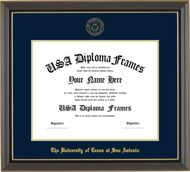 The University of Texas at San Antonio – Single Horizontal Document ( Diploma ) – Black Gold Trim Glossy – Navy Mat – Gold Accent Mat – With Seal(University Seal Gold) – With Gold Embossing (The University of Texas at San Antonio)