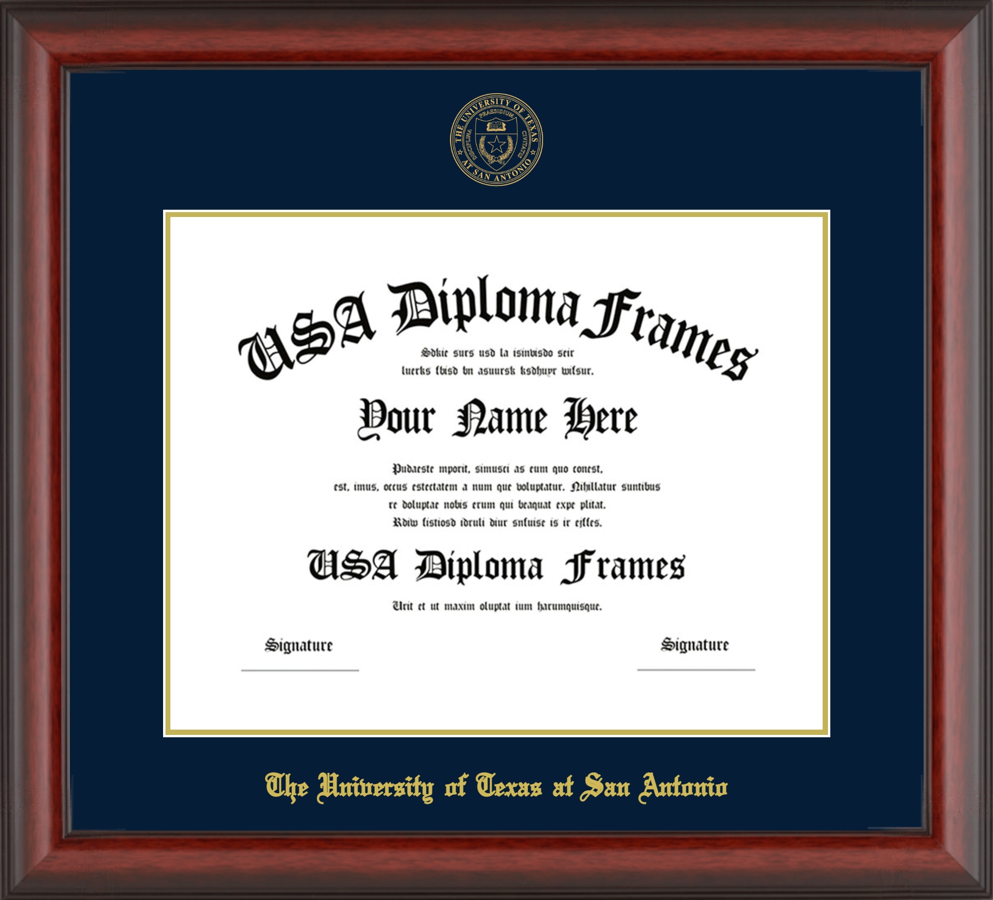 The University of Texas at San Antonio – Single Horizontal Document ( Diploma ) – Cherry Mahogany Matte – Navy Mat – Gold Accent Mat – With Seal(University Seal Gold) – With Gold Embossing (The University of Texas at San Antonio)