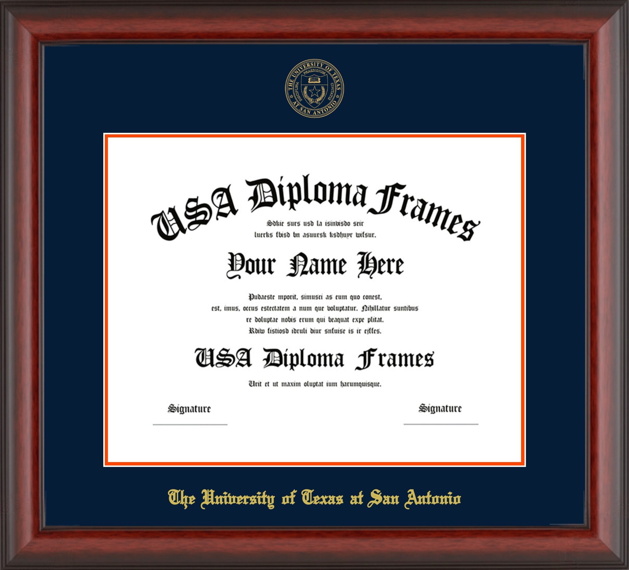 The University of Texas at San Antonio – Single Horizontal Document ( Diploma ) – Cherry Mahogany Matte – Navy Mat – Orange Accent Mat – With Seal(University Seal Gold) – With Gold Embossing (The University of Texas at San Antonio)