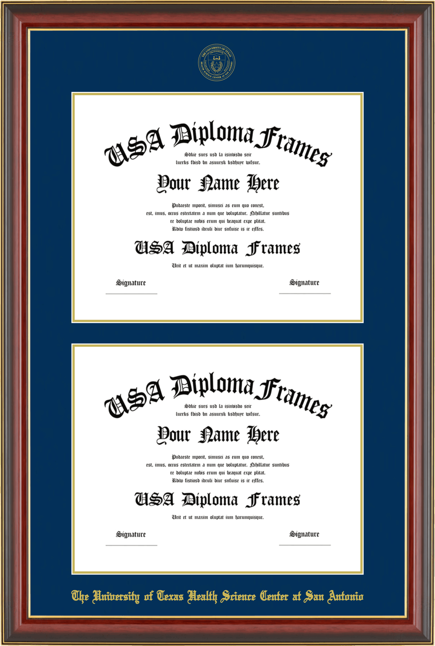 The University of Texas Health Science Center at San Antonio Double Diploma Frame – Double Document – Cherry Mahogany Gold Trim Glossy – Navy and Gold Mat