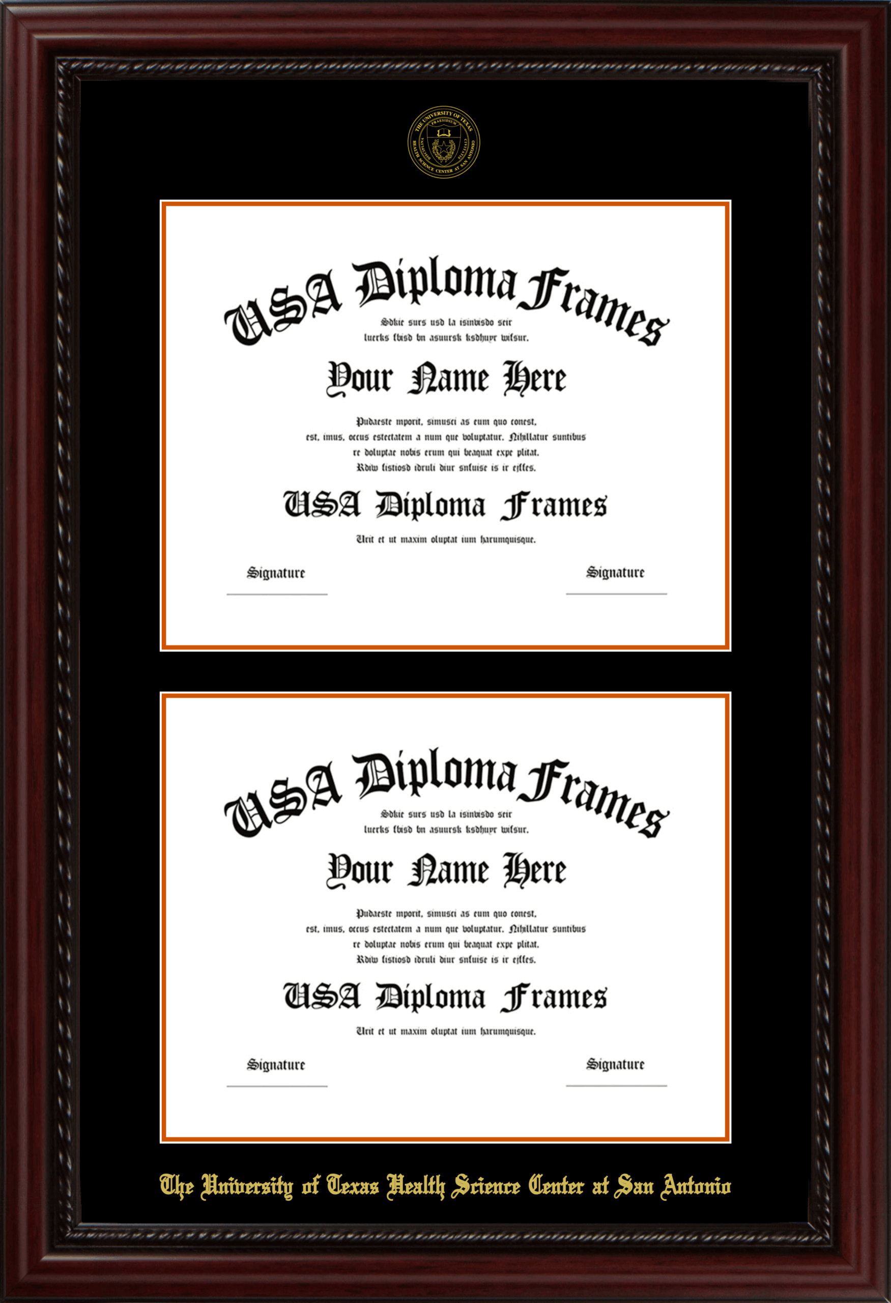The University of Texas Health Science Center at San Antonio Double Diploma Frame – Double Document – Executive Cherry Rope – Black and Burnt Orange Mat