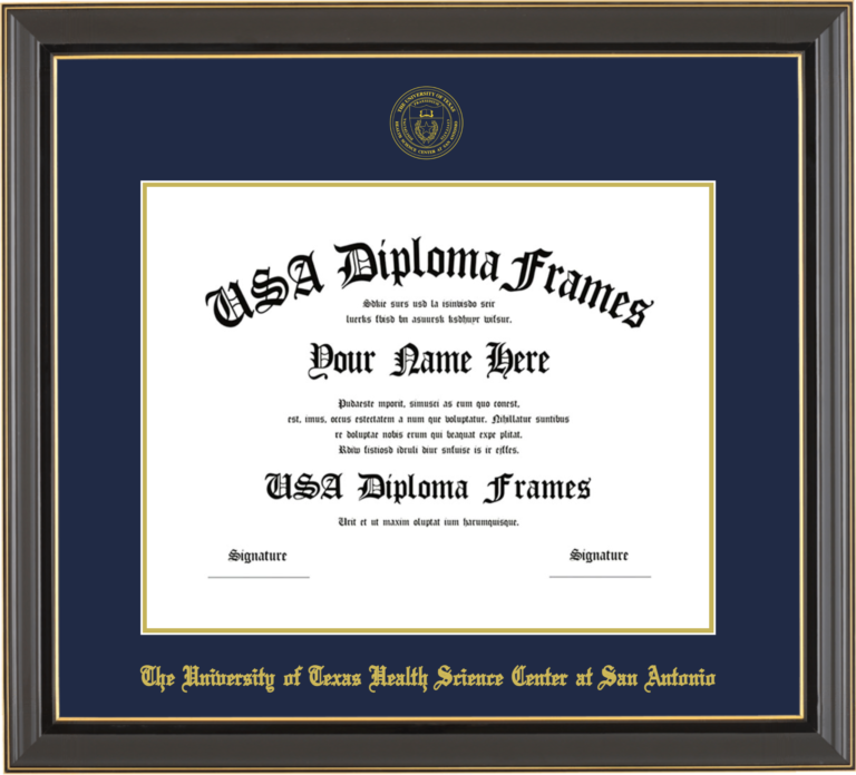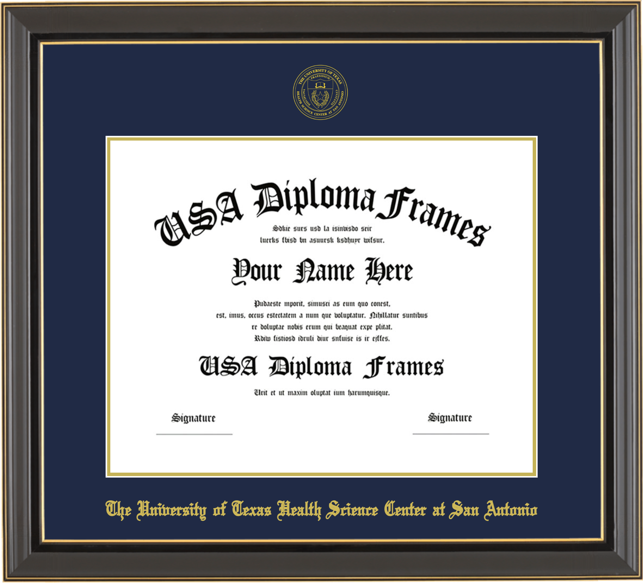 The University of Texas Health Science Center at San Antonio – Single Horizontal Document ( Diploma ) – Black Gold Trim Glossy – Navy Mat – Gold Accent Mat – With Seal(University Seal Gold) – With Gold Embossing (The University of Texas Health Science Center at San Antonio)