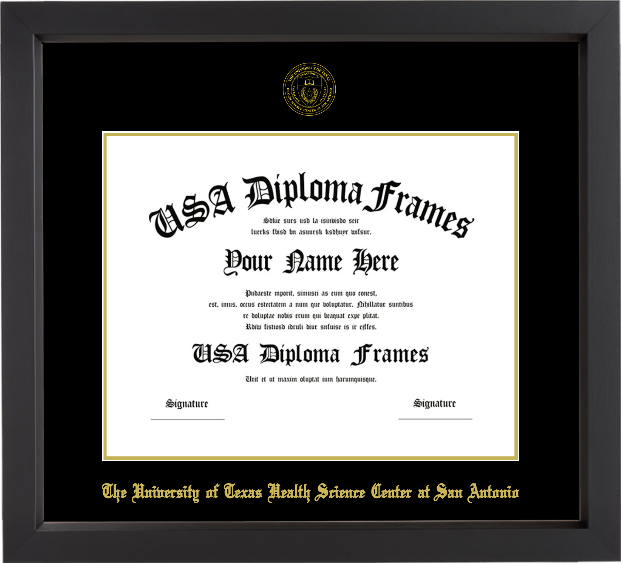 The University of Texas Health Science Center at San Antonio Diploma Frame – Black Matte – Black and Gold Mat