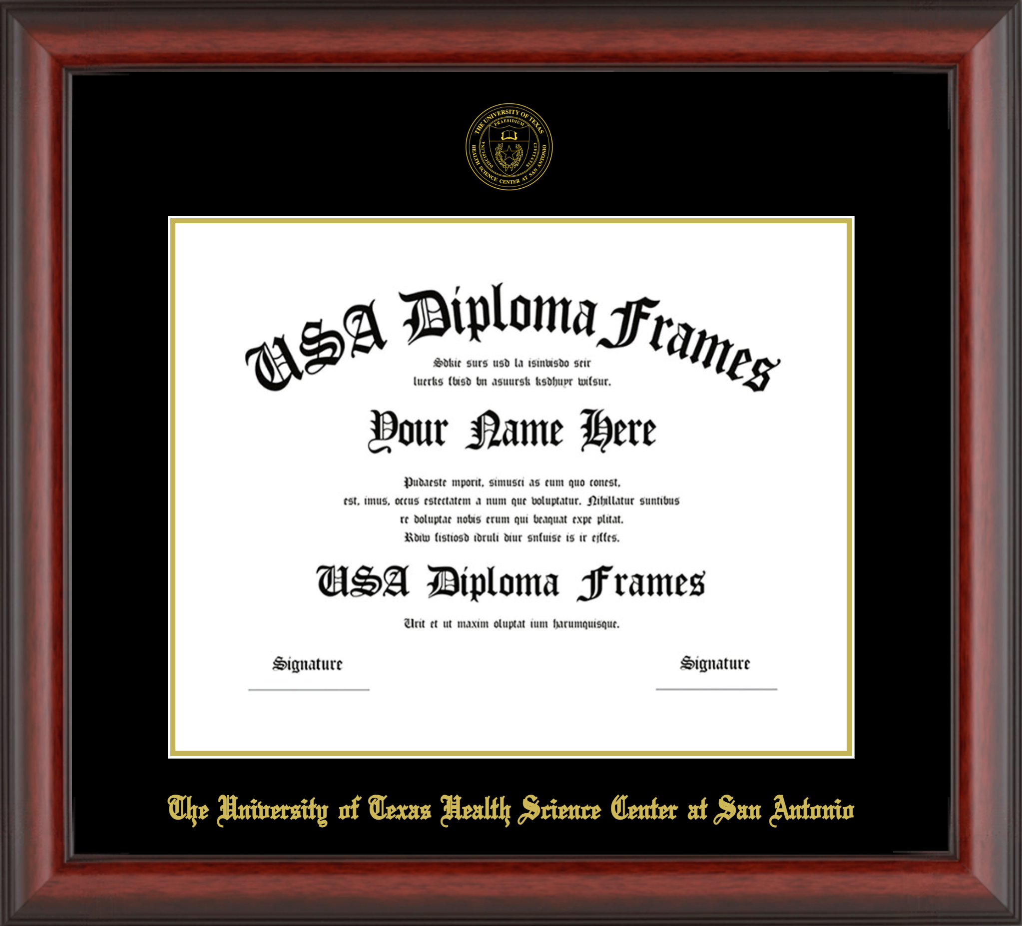 The University of Texas Health Science Center at San Antonio Diploma Frame – Cherry Mahogany Matte – Black and Gold Mat