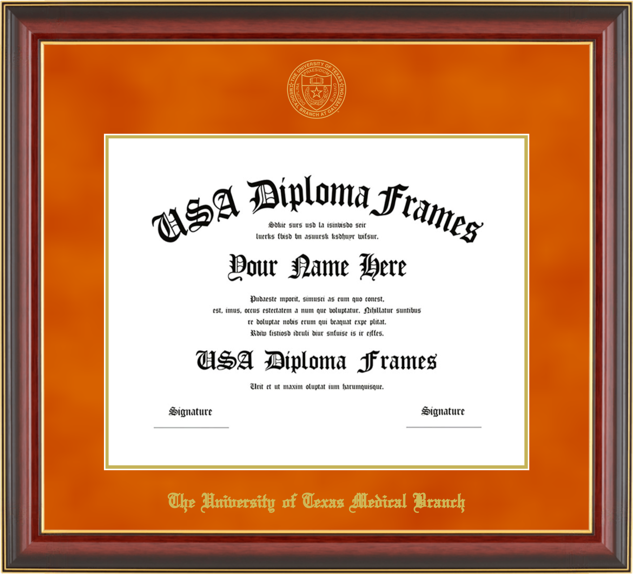 The University of Texas Medical Branch at Galveston – Single Horizontal Document ( Bachelors/Masters ) – Cherry Mahogany Gold Trim Glossy – Burnt Orange Suede Mat – Gold Accent Mat – With Seal(University Seal Gold) – With Gold Embossing (The University of Texas Medical Branch)