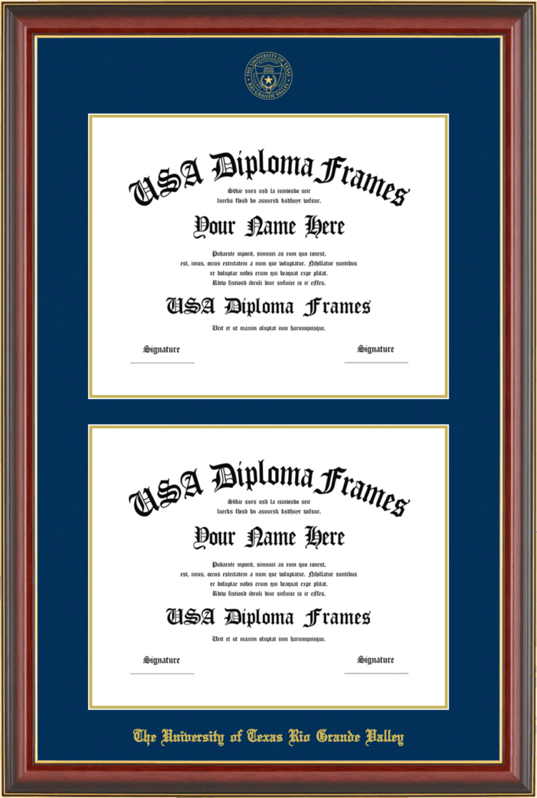 The University of Texas Rio Grande Valley Double Diploma Frame – Double Document – Cherry Mahogany Gold Trim Glossy – Navy and Gold Mat