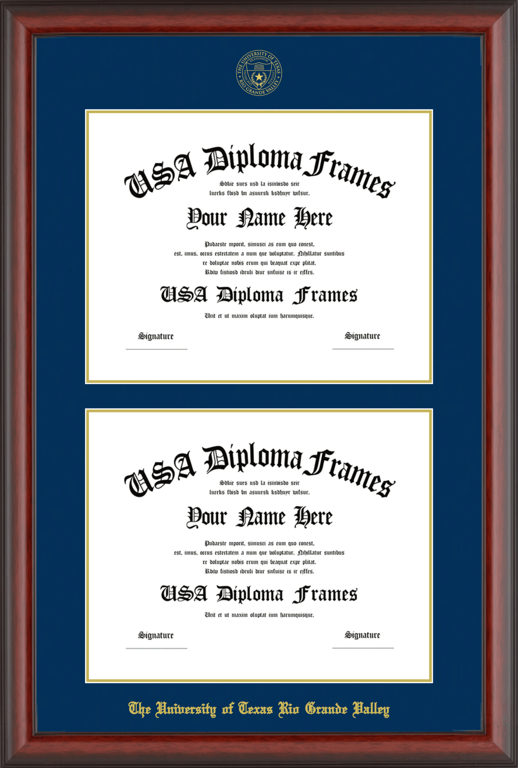 The University of Texas Rio Grande Valley Double Diploma Frame – Double Document – Cherry Mahogany Matte – Navy and Gold Mat