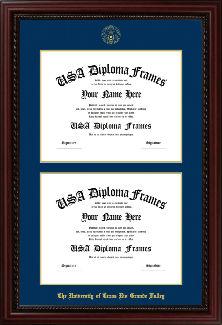 The University of Texas Rio Grande Valley Double Diploma Frame – Double Document – Executive Cherry Rope – Navy and Gold Mat