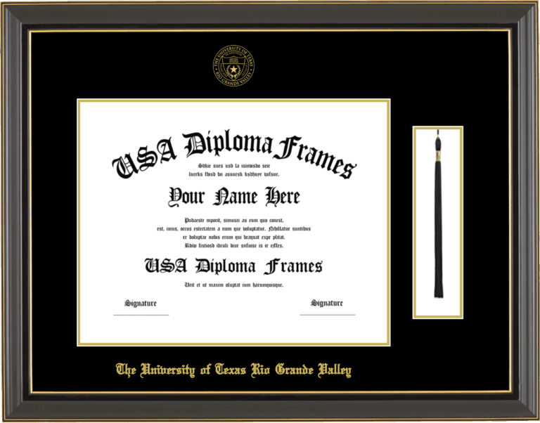 The University of Texas Rio Grande Valley Diploma Frame with Tassel – UTRGV – Black Gold Trim Glossy – Black and Gold Mat