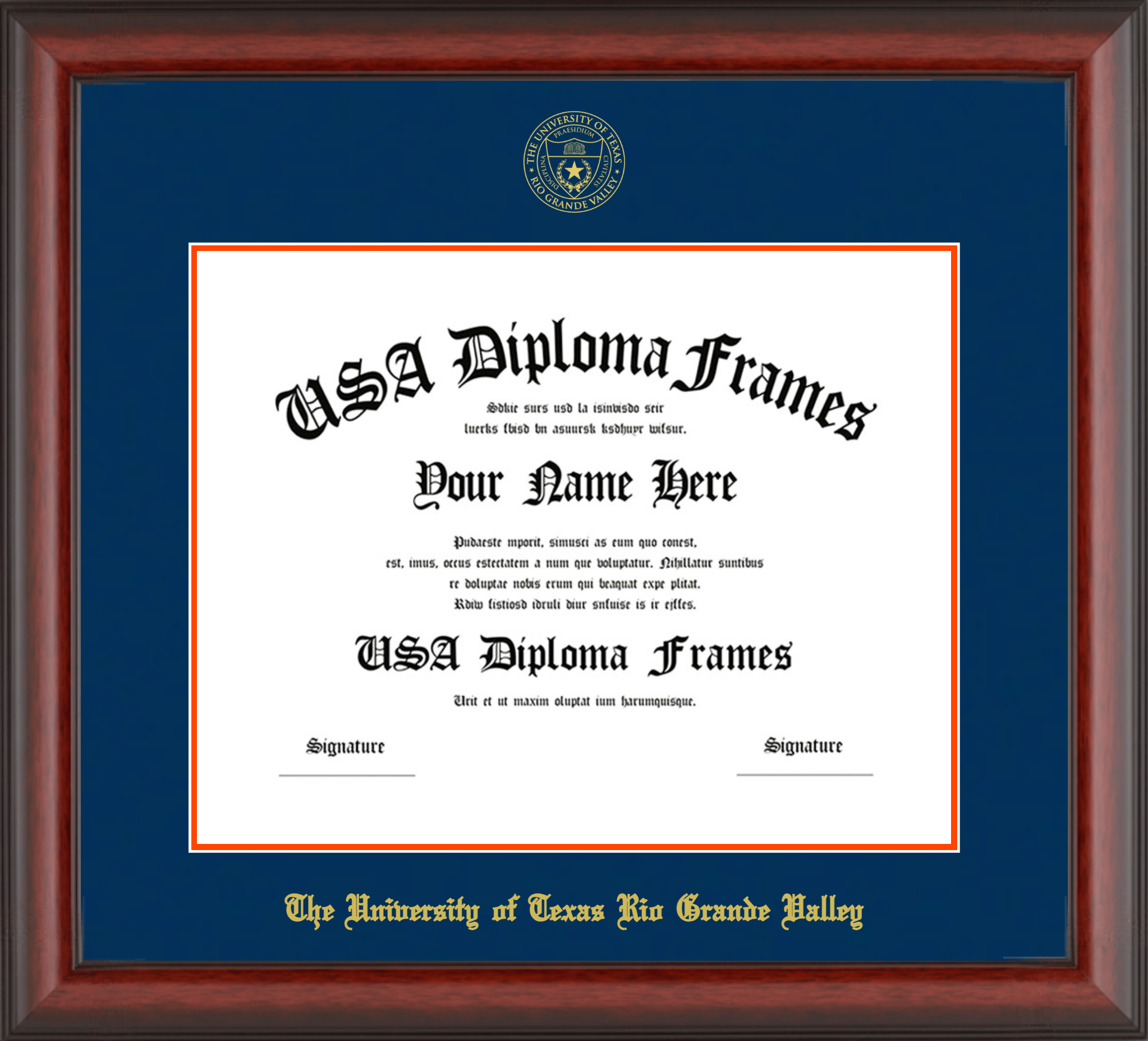 The University of Texas Rio Grande Valley Diploma Frame – UTRGV – Cherry Mahogany Matte – Navy and Orange Mat