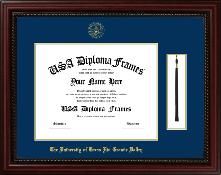 Want to explore more styles? Browse our full range of diploma frame layouts, or visit the The University of Texas Rio Grande Valley to view options available for your school. Looking for a fully personalized design? Try our custom Frame Builder and create a frame that’s uniquely yours.