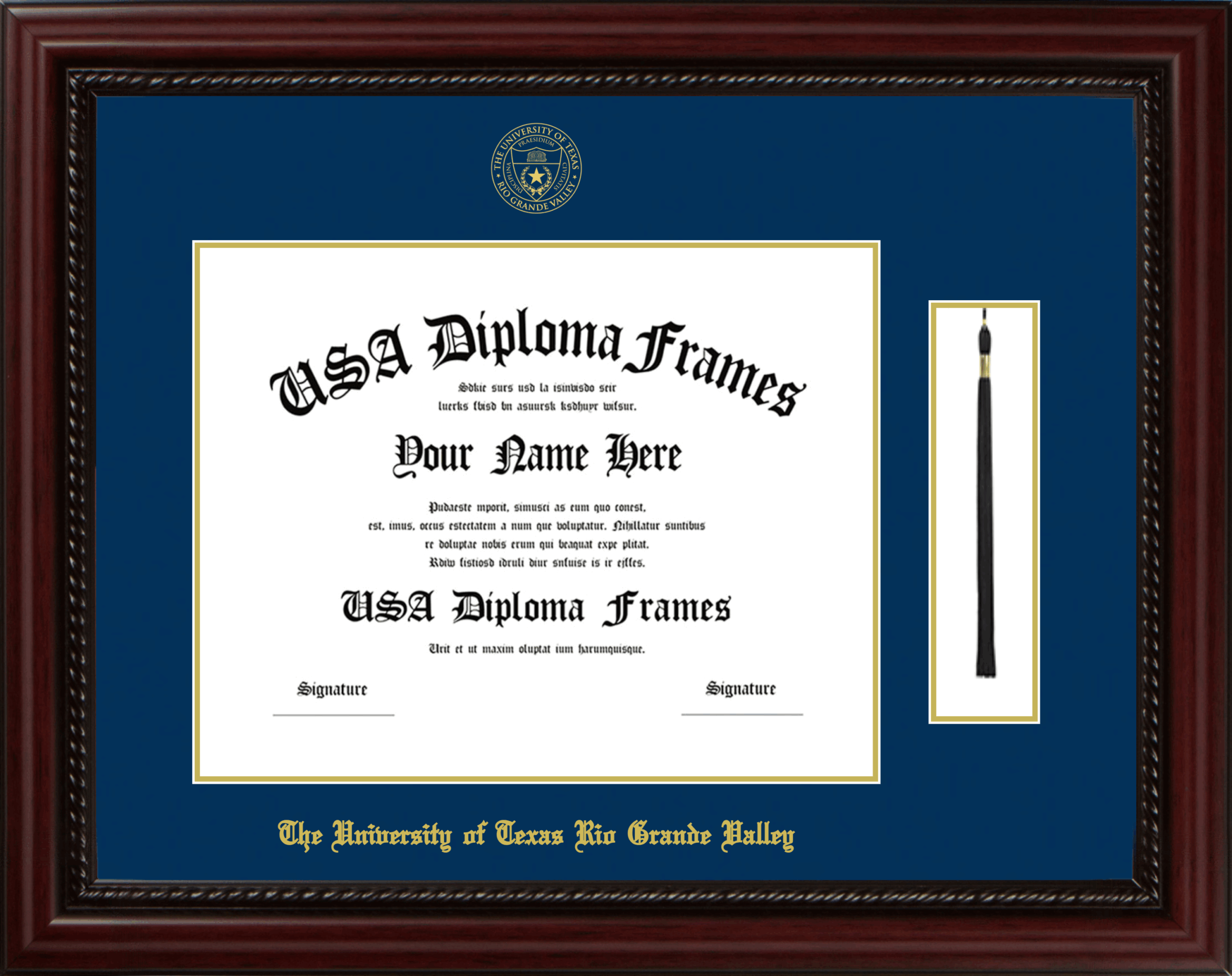 The University of Texas Rio Grande Valley Diploma Frame with Tassel – UTRGV – Executive Cherry Rope – Navy and Gold Mat