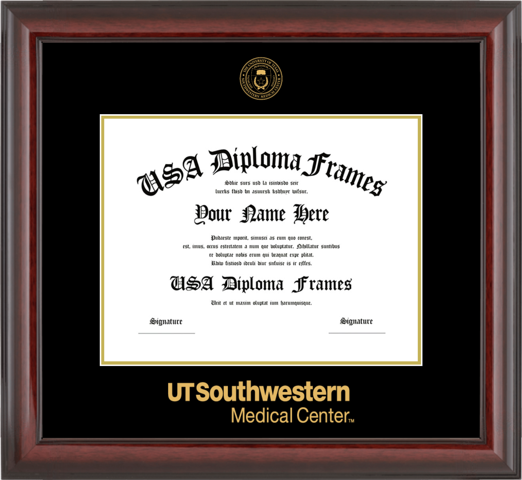 The University of Texas Southwestern Medical Center at Dallas – Single Horizontal Document ( Certificate/Diploma ) – Cherry Mahogany Glossy – Black Mat – Gold Accent Mat – With Seal(University Seal Gold) – With Image Embossing(University Logo Gold)
