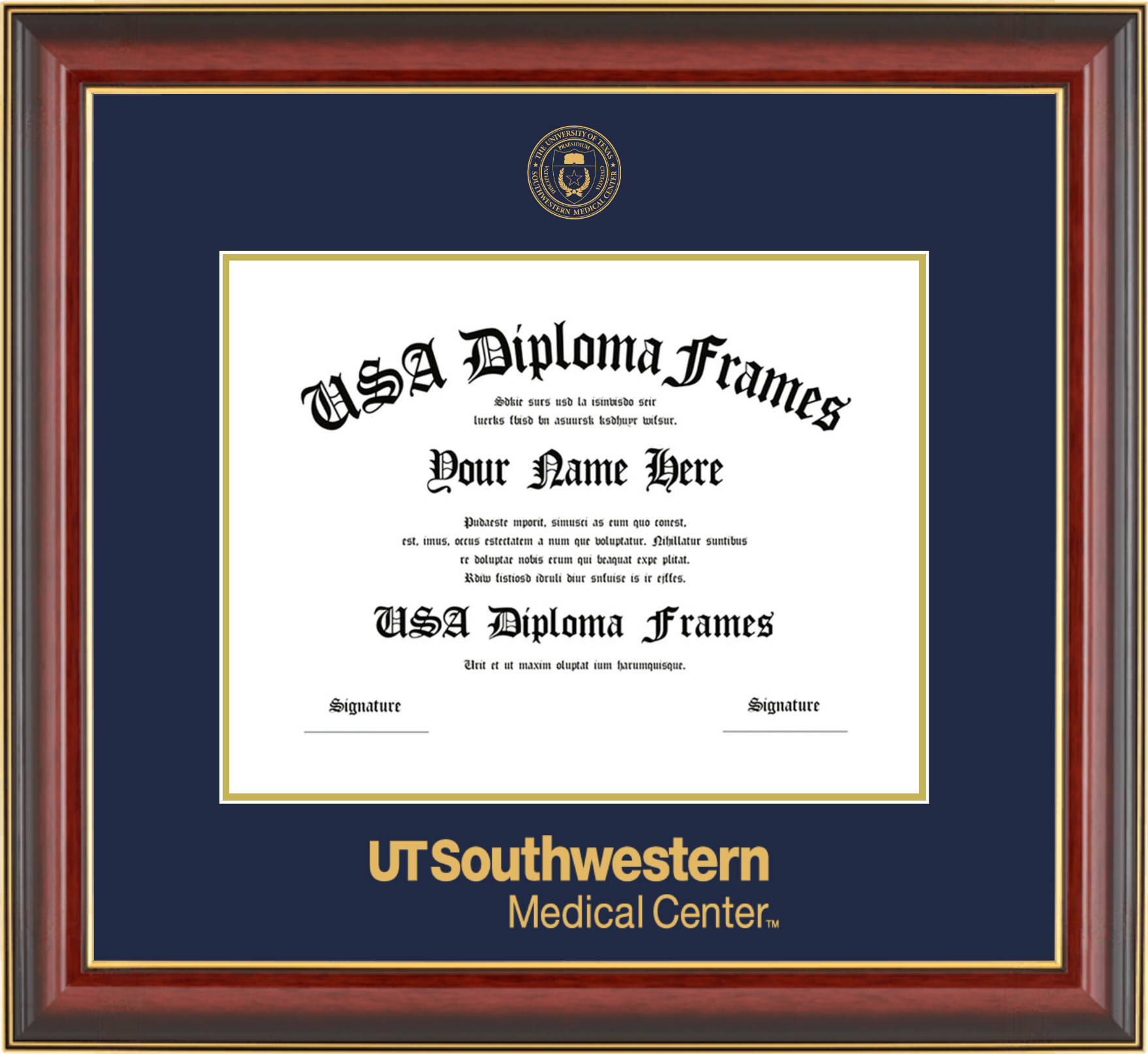 The University of Texas Southwestern Medical Center at Dallas Diploma Frame – 8.5×11 Certificate – Cherry Mahogany Gold Trim Glossy – Navy and Gold Mat – UTSW