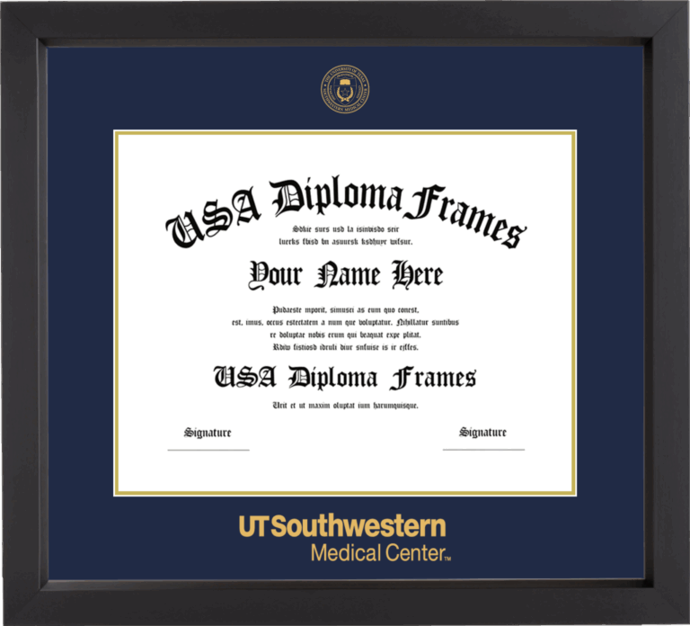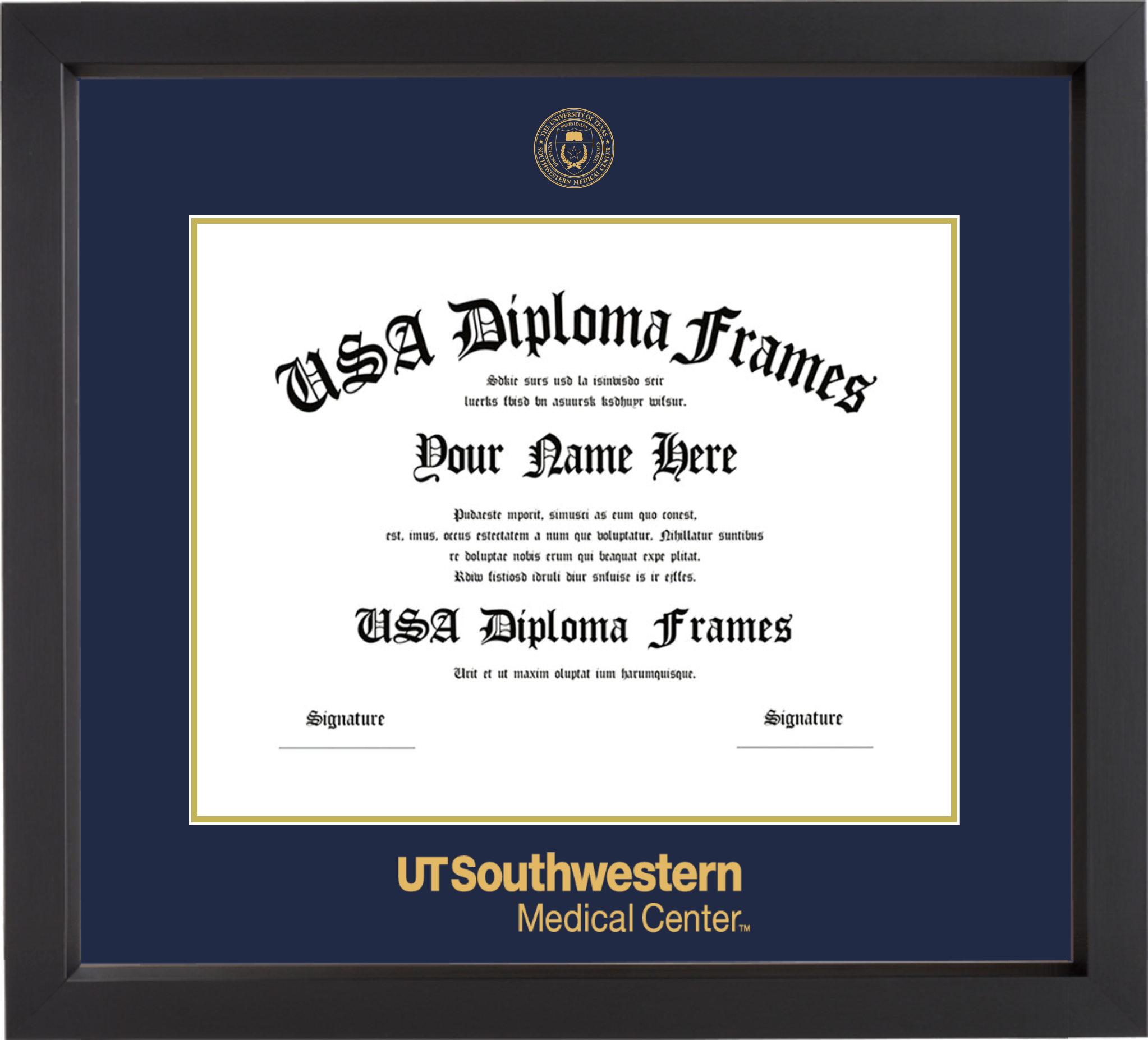 The University of Texas Southwestern Medical Center at Dallas Diploma Frame- 11×14 Master’s/PhD – Black Matte – Navy and Gold Mat – UTSW