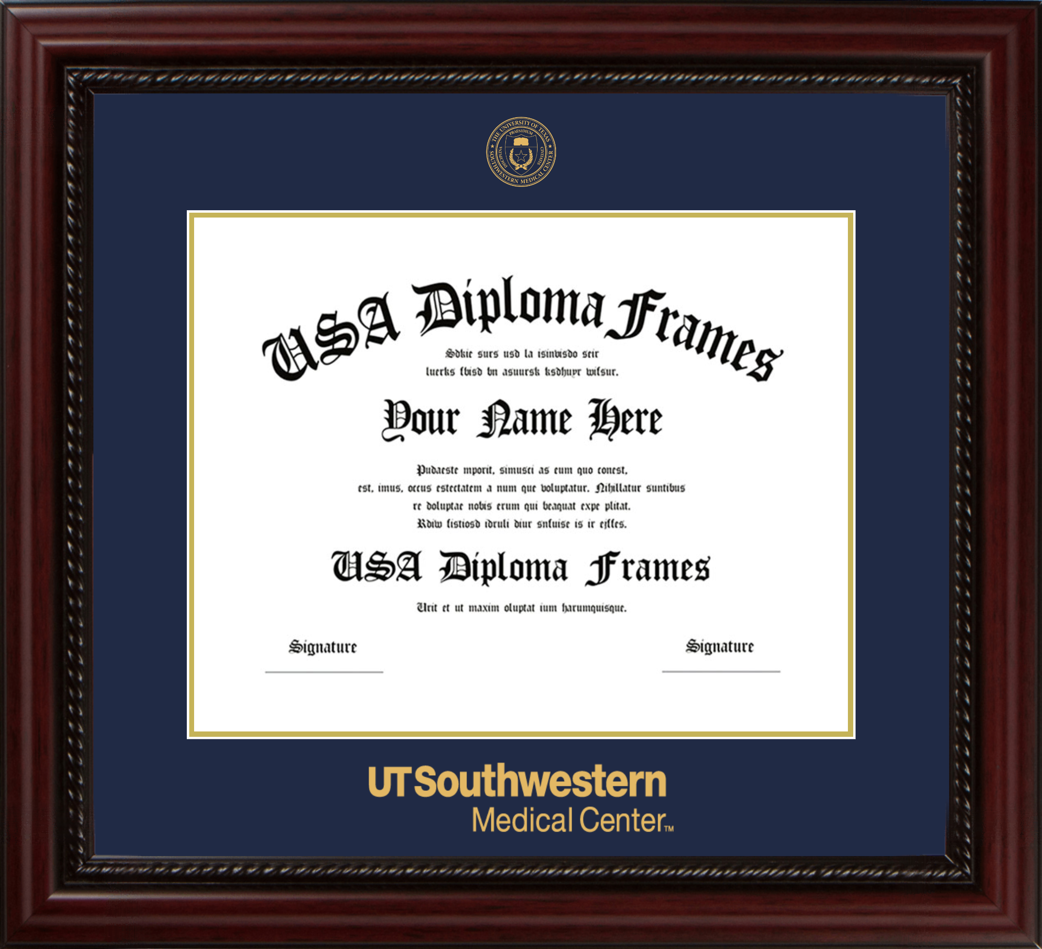 The University of Texas Southwestern Medical Center at Dallas Diploma Frame- 11×14 Master’s/PhD – Executive Cherry Rope – Navy and Gold Mat – UTSW
