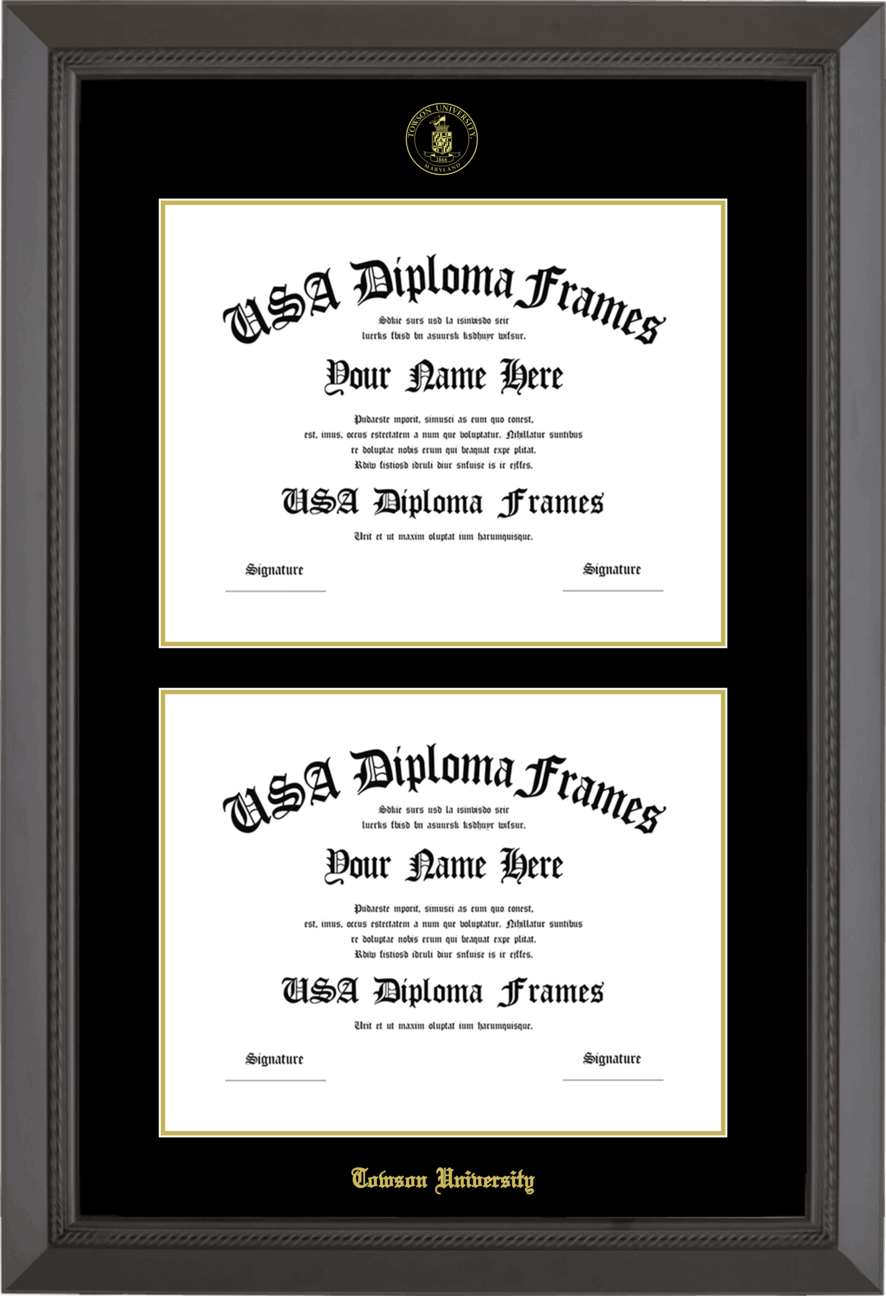 Towson University Double Diploma Frame – Double Document – Black Rope – Black and Gold Mat