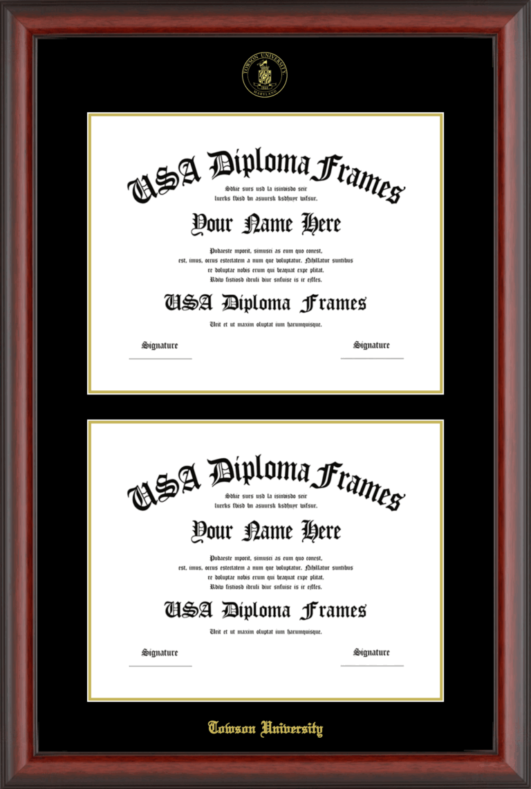 Towson University Double Diploma Frame – Double Document – Cherry Mahogany Matte – Black and Gold Mat