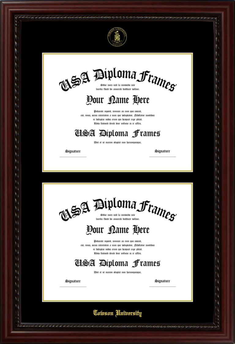 Towson University Double Diploma Frame – Double Document – Executive Cherry Rope – Black and Gold Mat