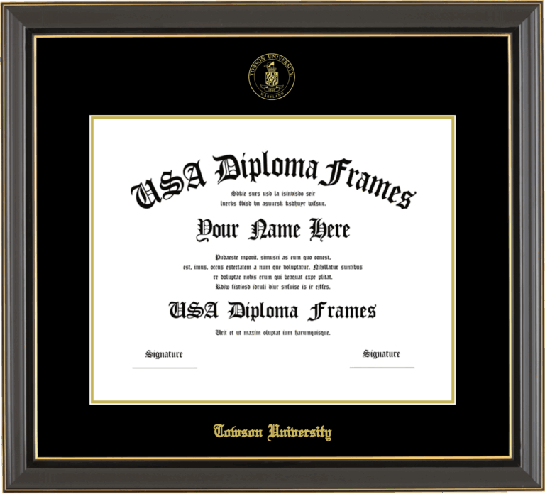 Towson University Diploma Frame – Black Gold Trim Glossy – Black and Gold Mat